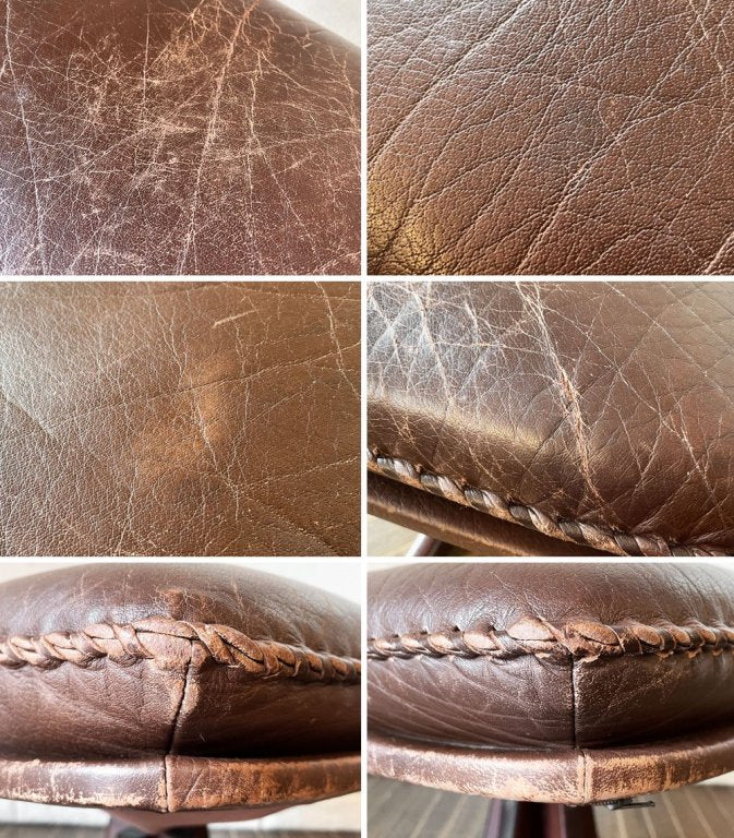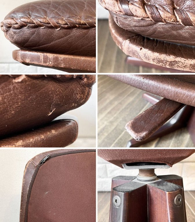 レザー全体に表面の剥がれやひび割れ、シミ汚れや色ムラ等が見受けられるとともに、僅かな破れの箇所がございます。また、脚部には擦れや傷、打痕、くすみなどの取り切れない汚れが見受けられます。なお、座面カバーのジップは固着のため開閉はできません。その他、レバーの動作がやや硬く感じられる場合がございますご使用に支障となるがたつきやぐらつきはございません。経年の風合いとしてお楽しみいただきながら、今後もまだまだ実用いただけます。