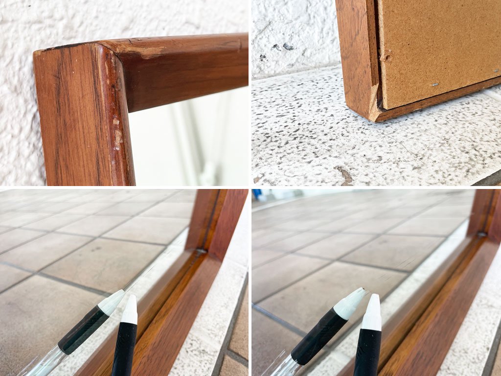 こちらはビンテージ品です。ミラーには一部線傷、フレームには擦れやペイントロス、一部裏面に欠けが見られますが、味としてお楽しみ頂けます。割れ等使用上問題となるダメージは無く、概ね良好なコンディションを保っております。