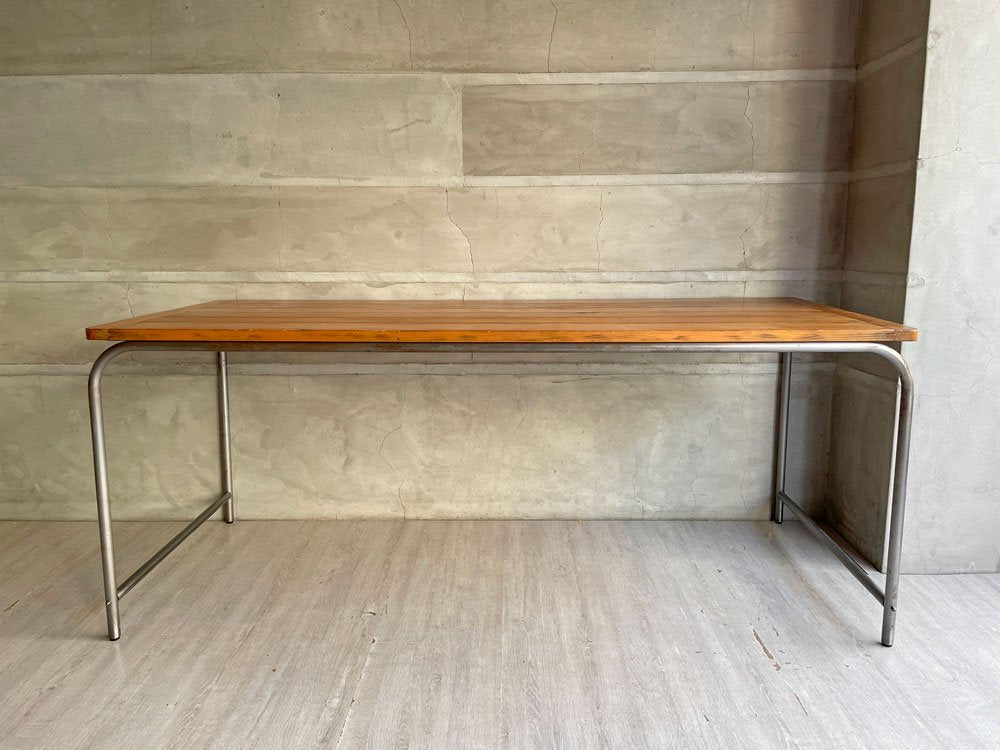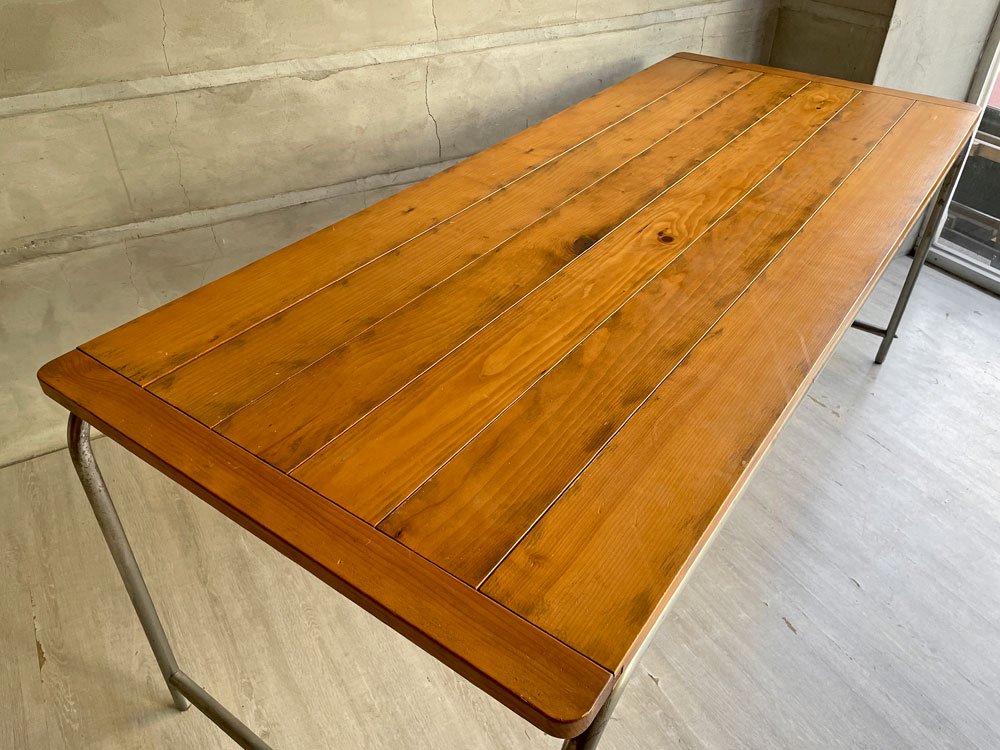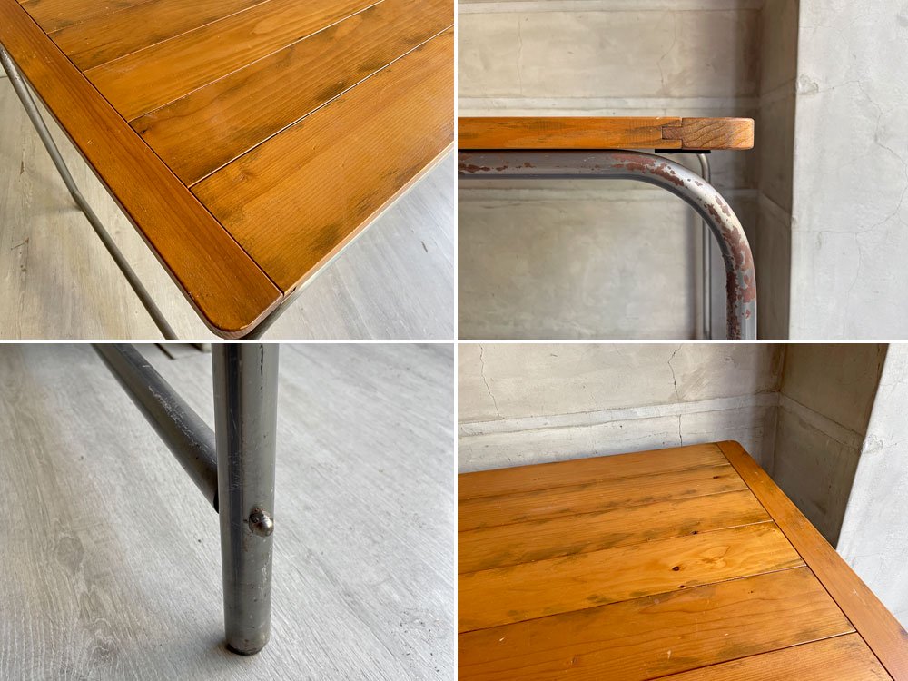 使用に伴い、天板表面には線傷や打痕、ガリ傷等小傷が散見されます。天板縁や側面にも同様のダメージが見受けられます。アイアンフレームには微細な錆やくすみ、擦れや打痕が見受けられますが風合いを大きく損ねるものではございません。また天板とフレームの接合部に、ボルトが最後まで閉まり切らない箇所がございますがガタつきなど等は無く、実使用には問題ございません。その他大きく目立つ様なダメージは無く、これからも実用頂けるコンディションを保っております。