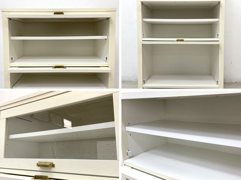 こちらは同社の定番シリーズ「シエル」のフラップ扉 3段キャビネットです。木製フレームにオフホワイトのペイントを施し、薄っすらと木の表情を残した温かみあるデザイン。3段のフラップ扉収納は、其々収納上部に格納できるフリップアップドアを採用。開いた状態でもスッキリとした佇まいで空間を演出してくれます。上段は中に仕舞ったもの物を見せながら収納出来るガラス扉収納。中段と下段は生活感の出やすい物を目隠ししながら収納可能な木製扉で構成されています。