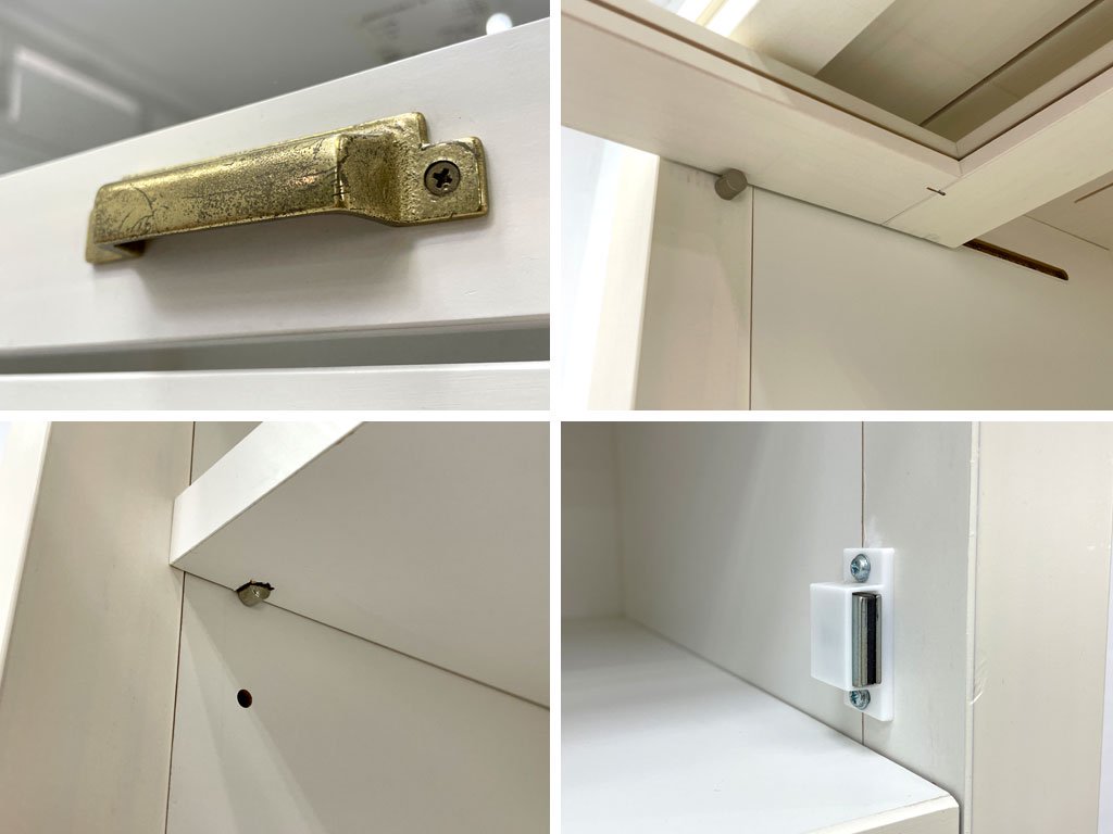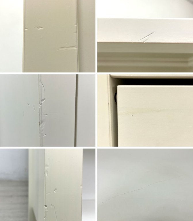 全体に擦れや傷、打痕やペイントロスが散見され、天板には色焼けや輪染みが見受けられます。また、棚板が一枚欠品しております。使用感はございますが、これからもまだまだ実用頂けるコンディションを保っております。