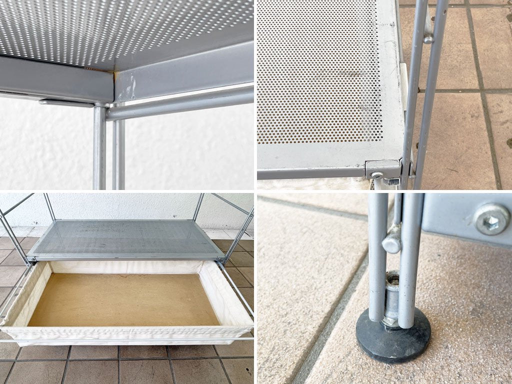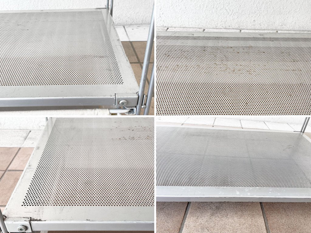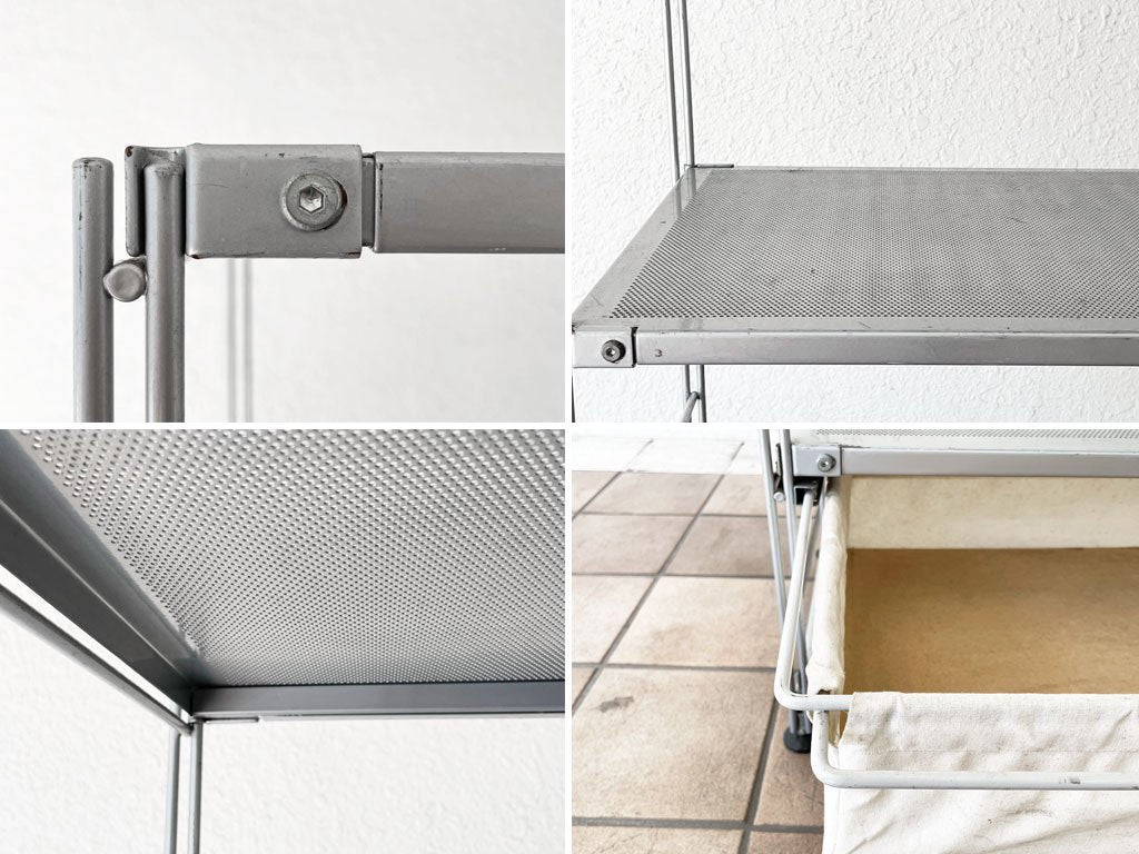 使用に伴う傷、打痕、取り切れない汚れ、塗装のダメージ、剥がれ、スチール部の錆やくすみが全体に見られ、使用感を感じさせるものとなっております。また帆布バスケットにも取り切れない汚れや色移り等があり、バスケット底部のMDF板にもスレや染みが御座います。背面クロスバーは欠品しており多少の横揺れはございますが、使用に問題となるようなガタツキや破損しているものは御座いません。これからも安心して実用して頂けるコンディションを保っております。