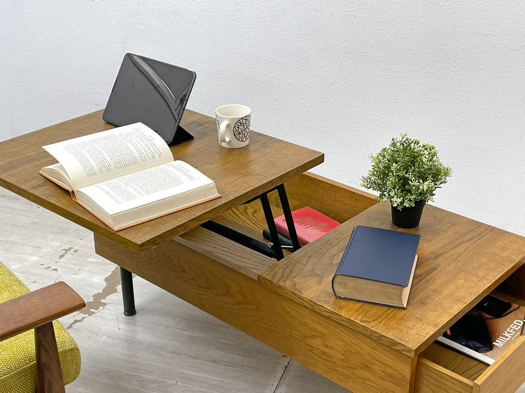天板の半分が昇降する事で、ソファでのPC作業や軽食が可能に。もう半分は抽斗収納となり、リモコンや読みかけの本を目隠ししながら収納出来る為、不要な生活感を軽減してくれます。