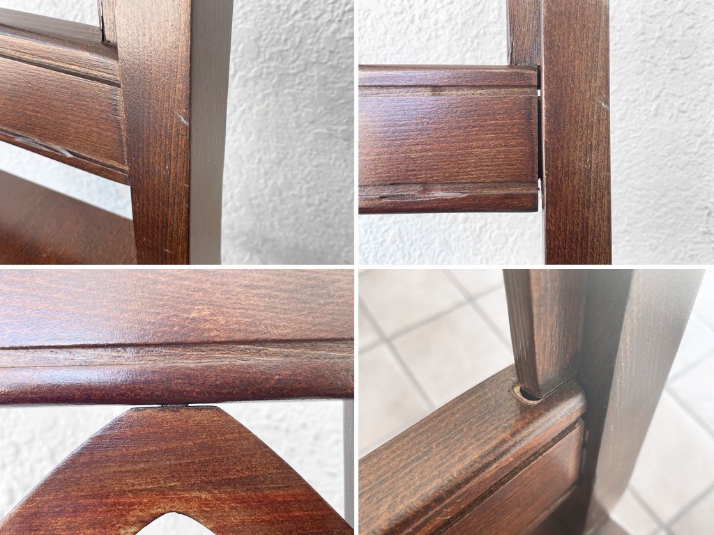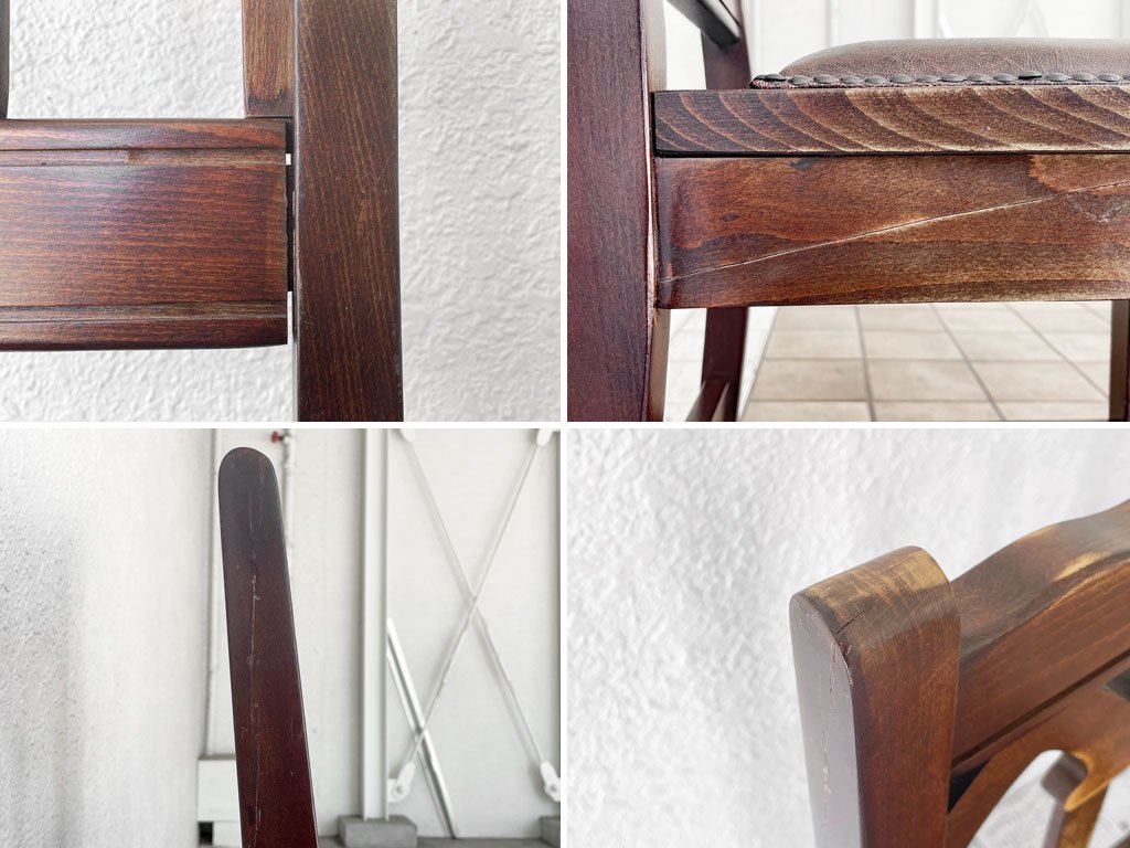 使用に伴いフレームには擦れや小傷が散見される他、クラックや接合部に隙間の出来ている箇所が見受けられますが、使用に支障はございません。また、1脚には一部シート縁の鋲の緩みがございますが、こちらも着座に影響のあるものではございません。ガタツキ等使用上大きな支障となるダメージは見られず、これからも安心してお使い頂けるコンディションを保っております。