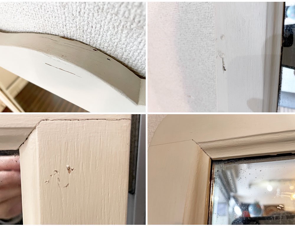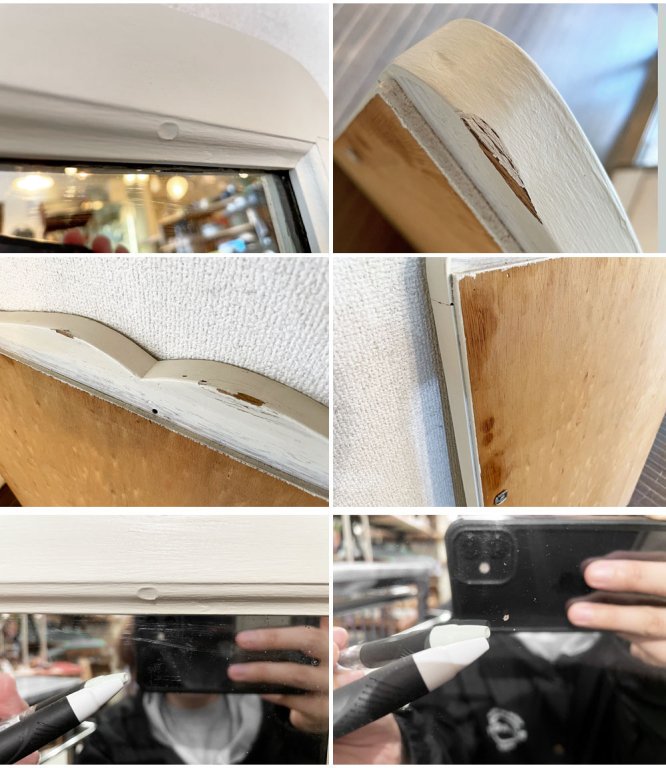 使用に伴い、木部には傷や打痕、ペイントのムラ、取り切れないシミ汚れがございます。また、鏡面には一部スクラッチ傷やくすみ、僅かな腐食が見られますが、欠けや割れといったご使用に問題となるダメージはございません。これからも実用頂けるコンディションを保っております。
