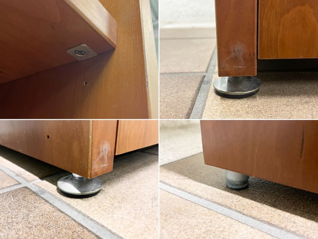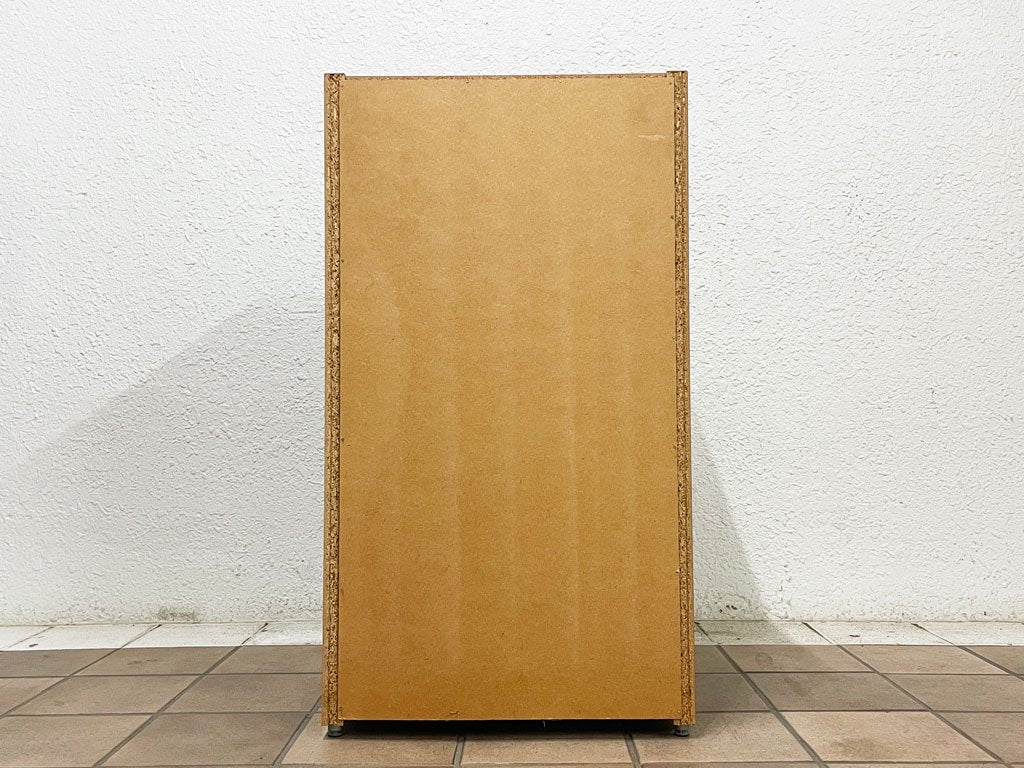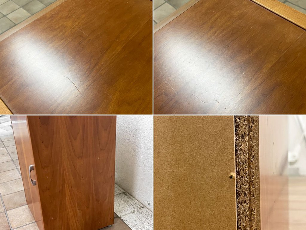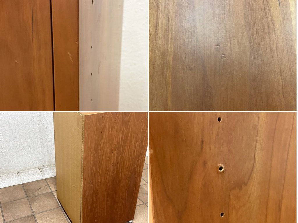 使用に伴い側面にヤケとダボ穴の広がり、その他天板に擦れと線傷、側面・前面と棚板に細かな打痕、金属部のくすみ等が見られますが、美観を損ねる程のものではございません。また背板には僅かなたわみと釘の抜けが一か所ございますがガタツキや割れ等使用上問題となるダメージも見られず、概ね良好なコンディションを保っております。