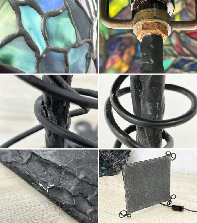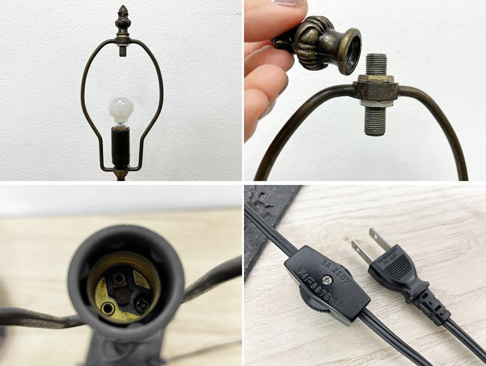 使用に伴う擦れや落としきれない汚れ、ペイントロスが全体に見られます。またシェードのガラスに一部軽微な欠け、ベース部分には素材特有の錆がございますが、実使用に問題ございません。中古品としては概ね良好なコンディションを保っております。