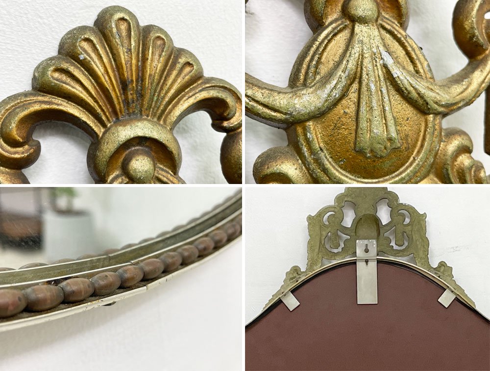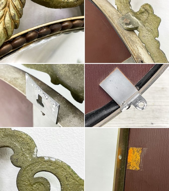 使用や経年に伴う擦れや傷、くすみや塗装の剥げ、サビや汚れ等がフレームに散見されます。その他、中央両端部分の裏蓋を固定する金具が欠品している箇所がございますが、現状蓋が外れてくるということも無く、ご使用に問題は特に問題ございません。ミラー自体に大きなダメージも見られず、ビンテージ品ならではの風合いをお楽しみいただきながら、これからも実用いただけるコンディションを保っております。