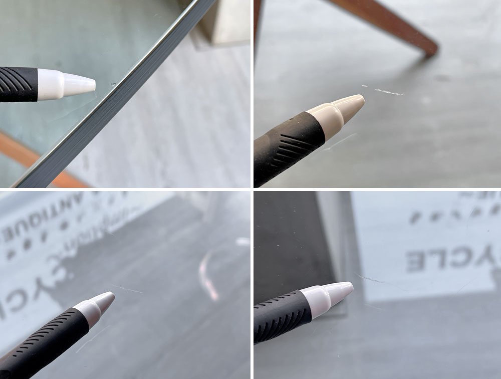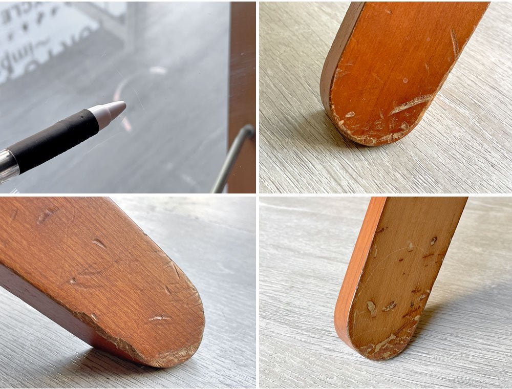 使用に伴い、ガラス天板には光の加減で確認できる細かな線傷が見受けられ、極僅かなチップが1か所ございます。また脚部には打痕や擦れに伴うペイントロスが散見されます。その他ご使用頂く上で問題となるような大きなダメージは無く、これからも実用頂けるコンディションを保っております。