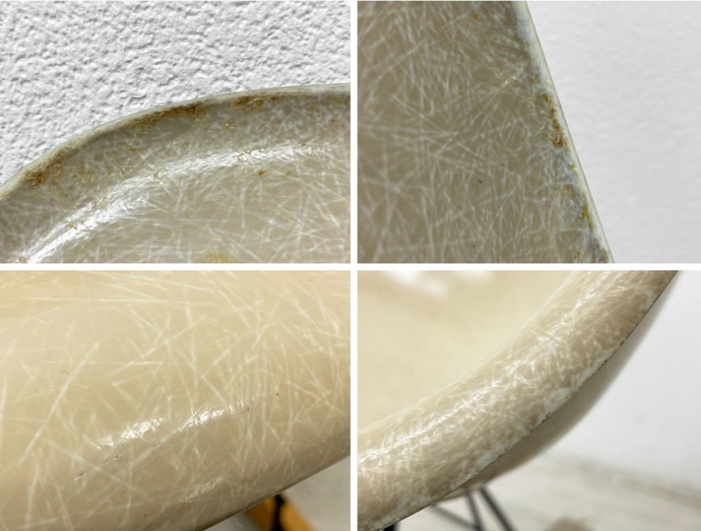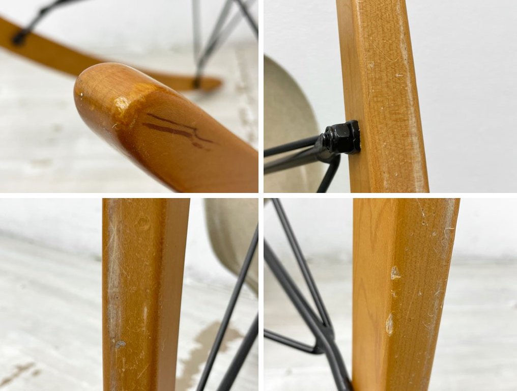 使用に伴う擦れや小傷の他、背もれには落としきれない汚れがございます。また、脚部は前後に揺れ動く設計の為、使用による擦れがございますが普段は死角となっているので、気にならないかと思います。美観を大きく損ねる様な汚れや、機能を損なうような大きなダメージはございません。