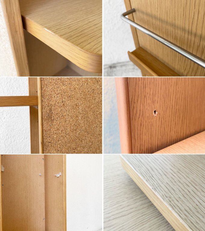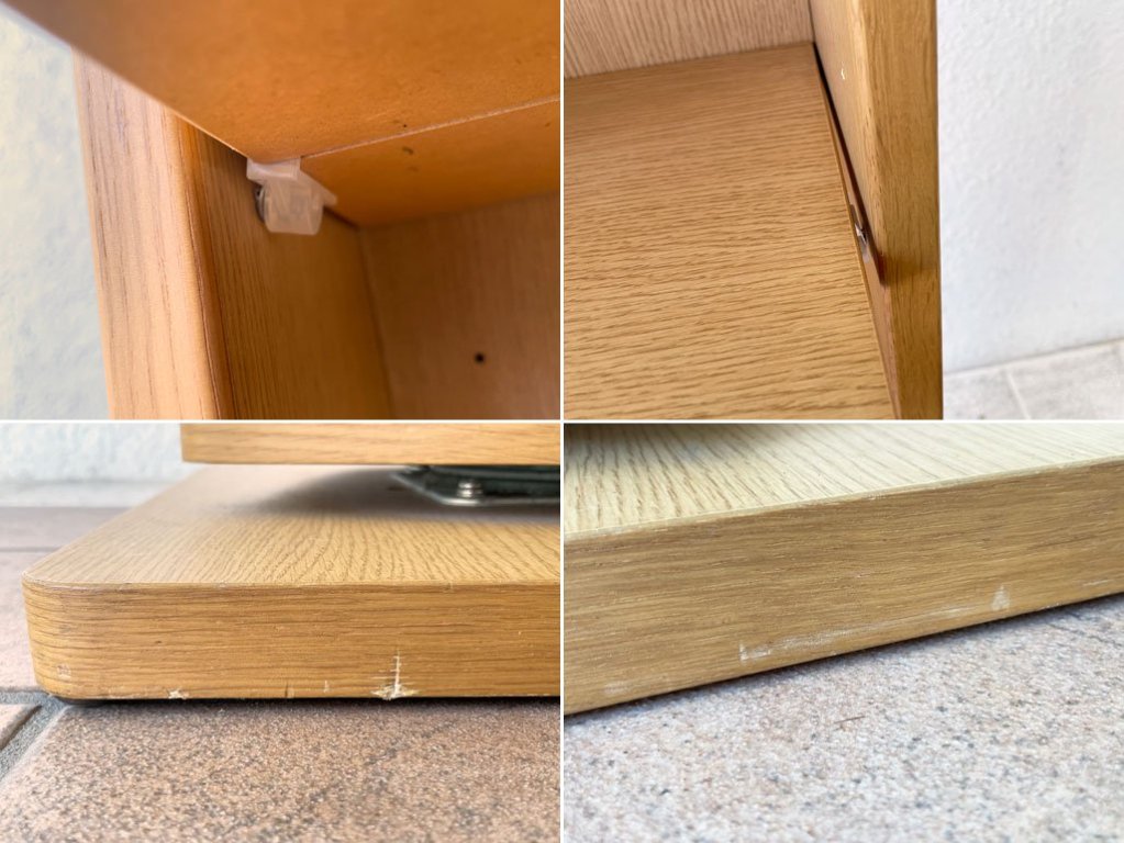 使用に伴いベース部に打痕と突板の軽微な割れ、棚板角にも同様のダメージが一部見られますが、大きく美観を損ねるものではございません。また、ダボ穴の広がりにより棚板を載せた際にダボがやや斜めになりますが、使用に支障はございません。その他使用上問題となるようなガタツキ、割れ等は見られず、概ね良好なコンディションを保っております。