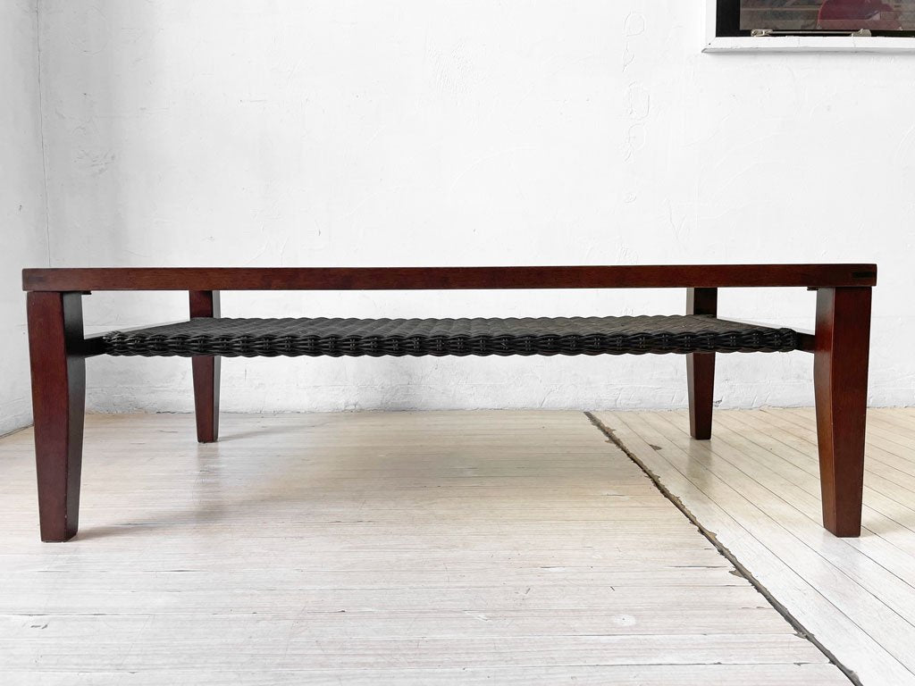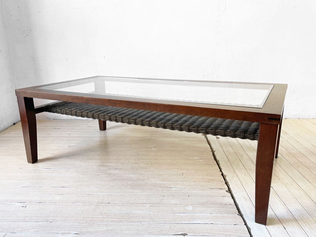 涼しげなガラス天板とラタン素材の棚板を組み合わせた、アジアンテイストの雰囲気漂うローテーブルです。