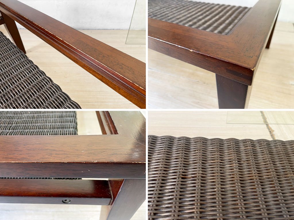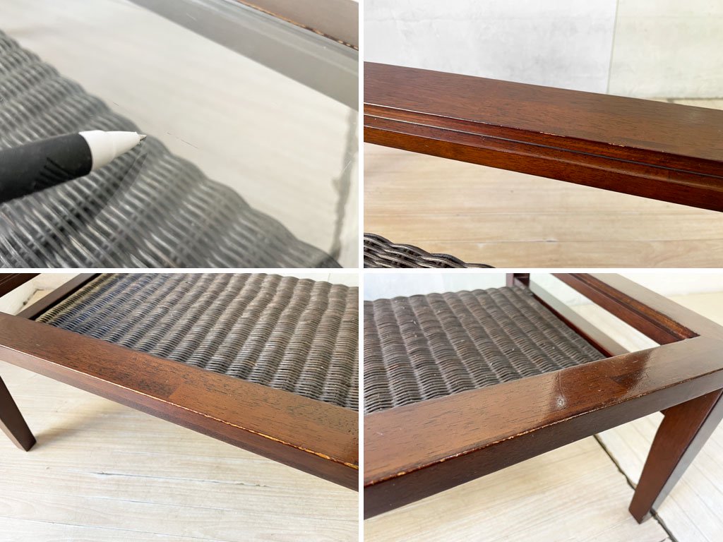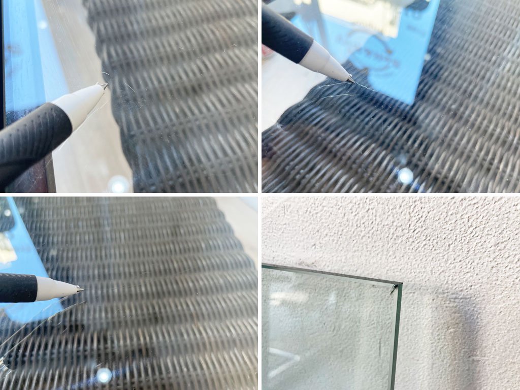 使用に伴い、フレームには傷や擦れ、打痕やペイントロス、補修ペンによるレタッチ痕、ラタン棚にはささくれが見受けられます。また、ガラス天板には傷や擦れ、角に僅かなヒビがございますが、強度に問題はございません。その他、ご使用に問題となるダメージは無く、これからも安心してご使用頂けるコンディションを保っております。