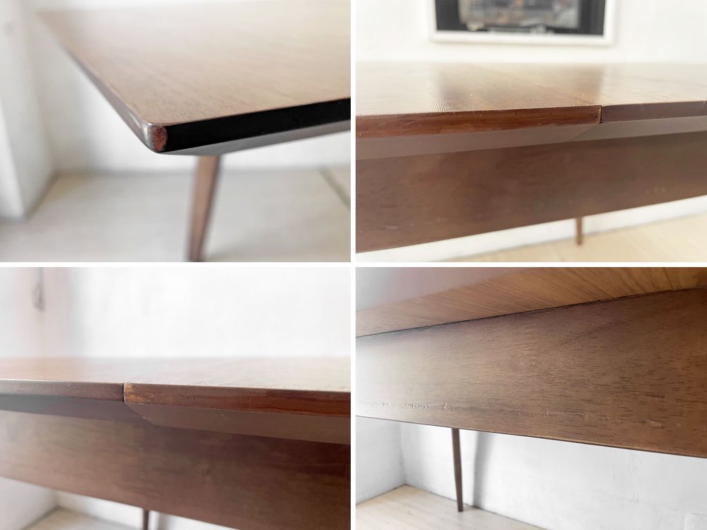 使用に伴い、傷や擦れ、ペイントロスや補修ペンによるレタッチ痕などが見受けられます。また、幕板の側面に細かな打痕が複数ございます。エクステンション天板の裏面に傷がございますが、通常の使用の際には見えない箇所となるため気にならない程度かと思われます。その他、使用に問題となるダメージは無く、USED品として概ね良好なコンディションを保っております。