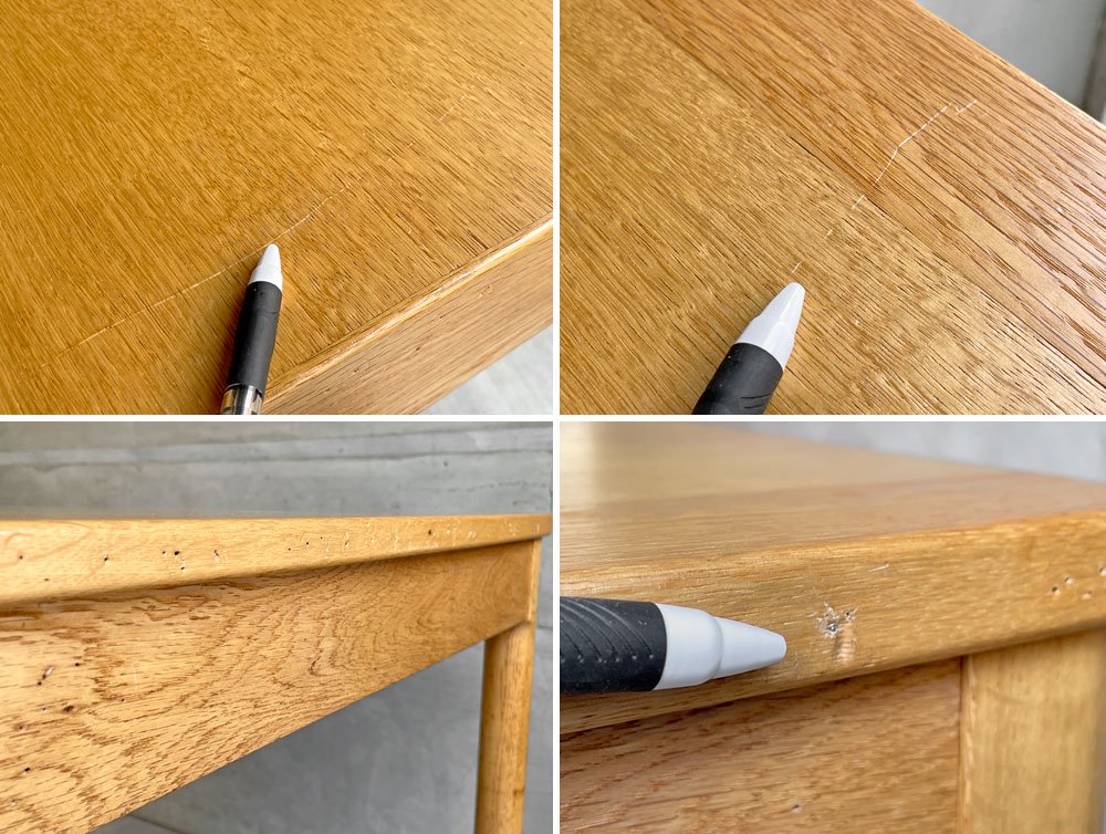 そのほか、天板に線傷、脚部に黒ずみや染み、各所に擦り傷や小傷といった経年なりの使用感こそ見られますが、通常使用に支障を来すような不具合はございません。