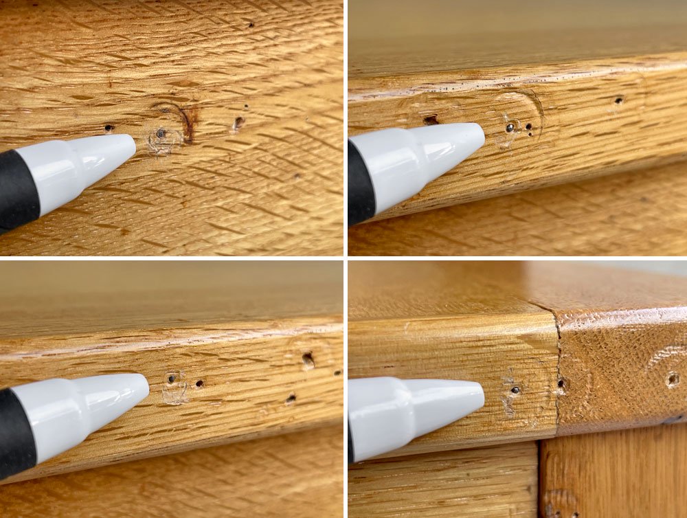 天板の側面に無数の画鋲痕があり、触って引っかかるほどではございませんが、鉄のピンが残っている箇所もございます。