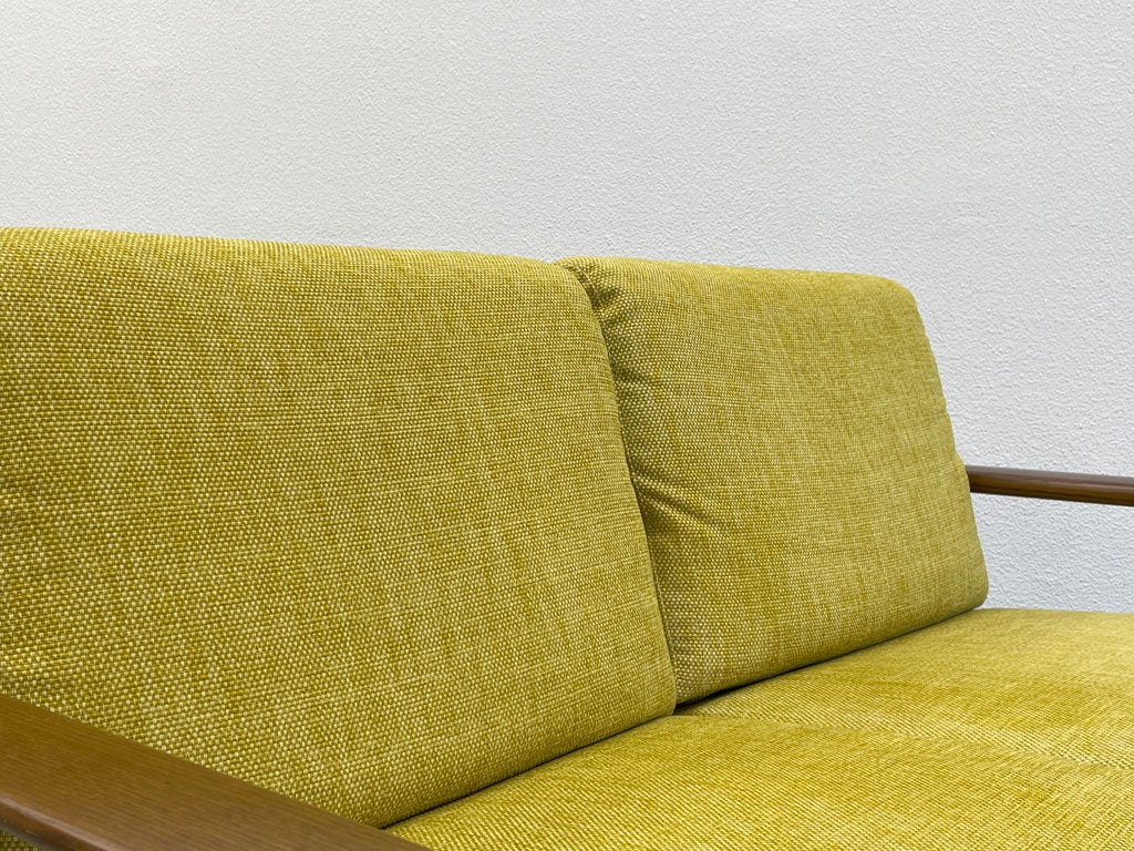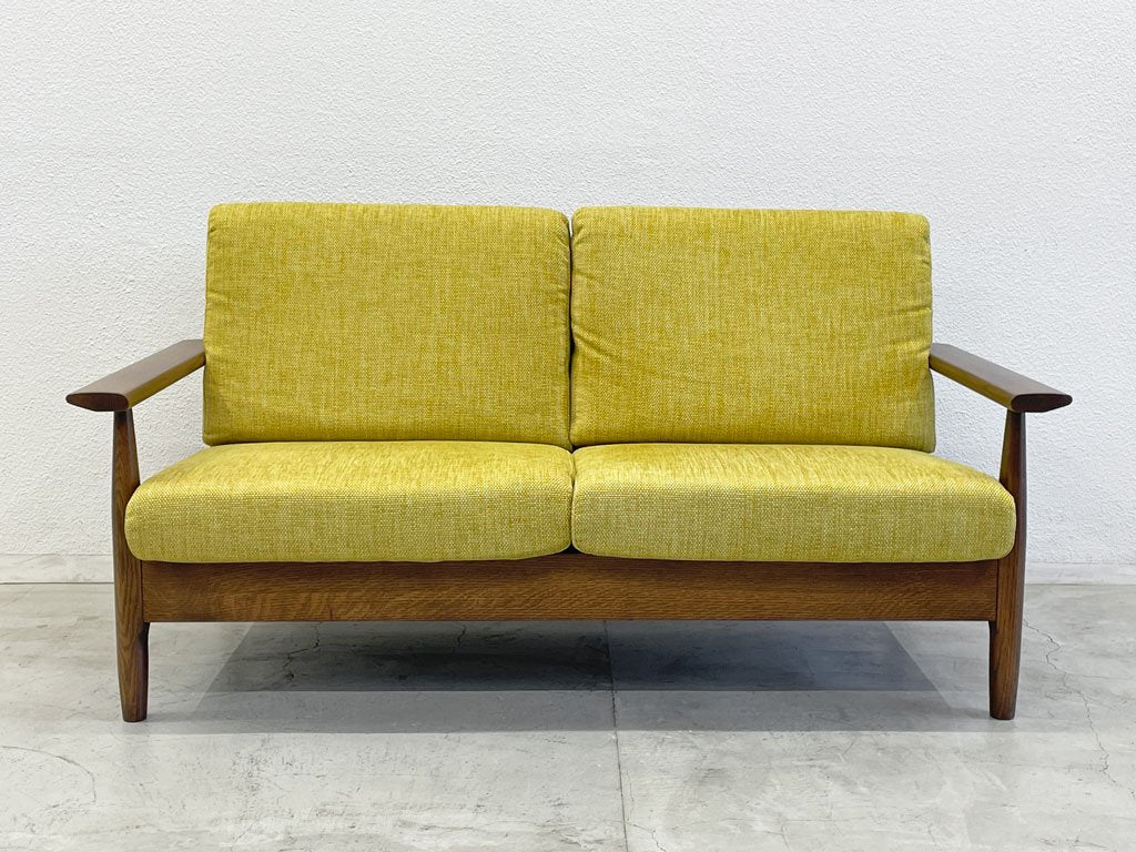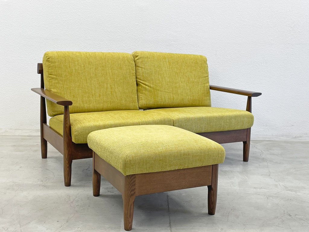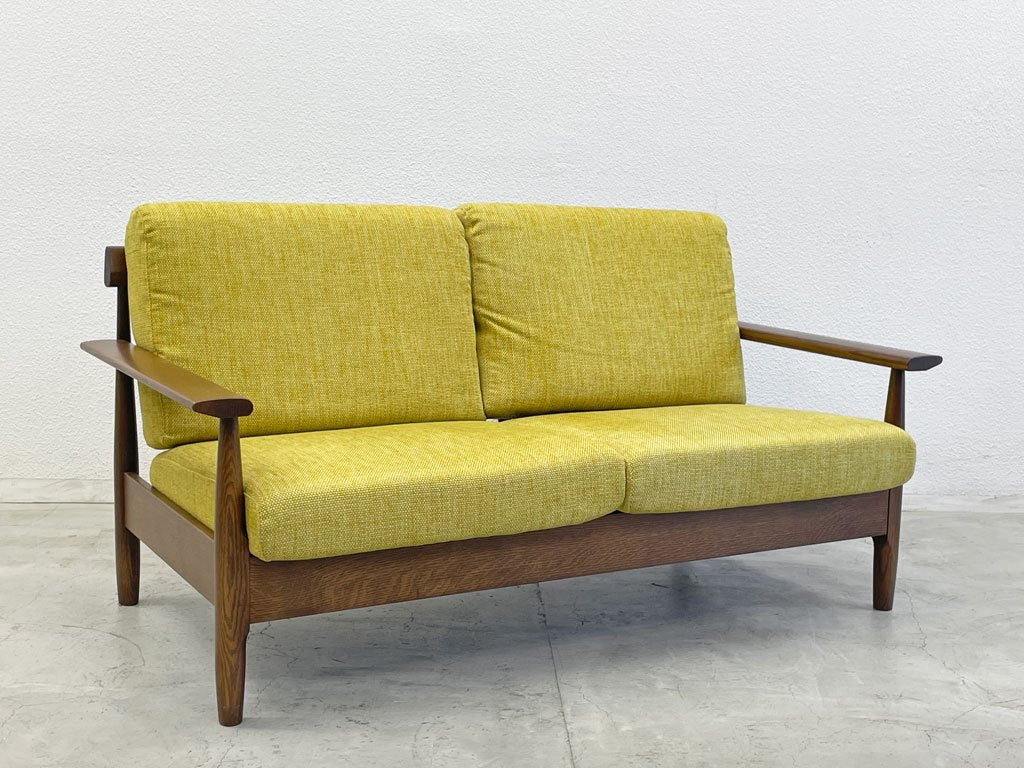 IDC大塚家具で販売されていた柏木工の製造のシガーロ 2シーターソファ。柏木工の高い木工技術による北欧家具を意識したデザインがとても素敵なソファとなります。木目をくっきりと見えるブラウン染色塗装とビビットなライムグリーンのようなファブリックが印象的なソファ。