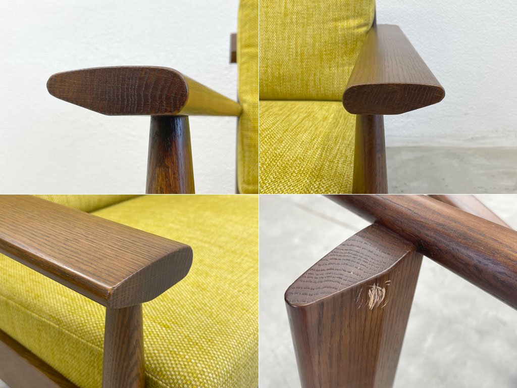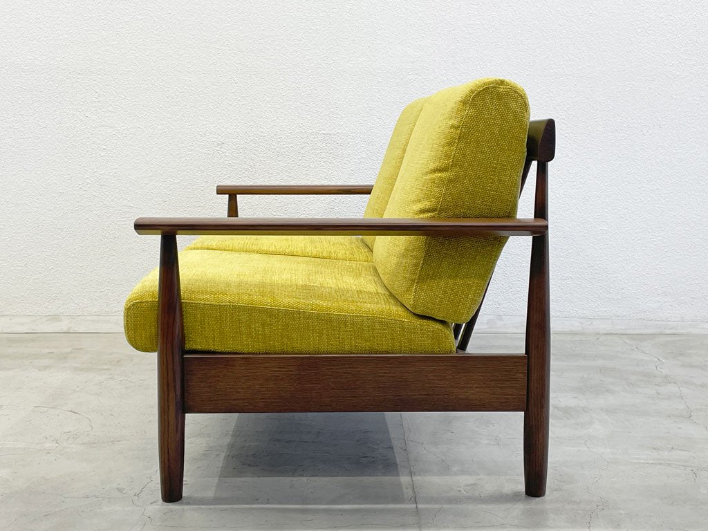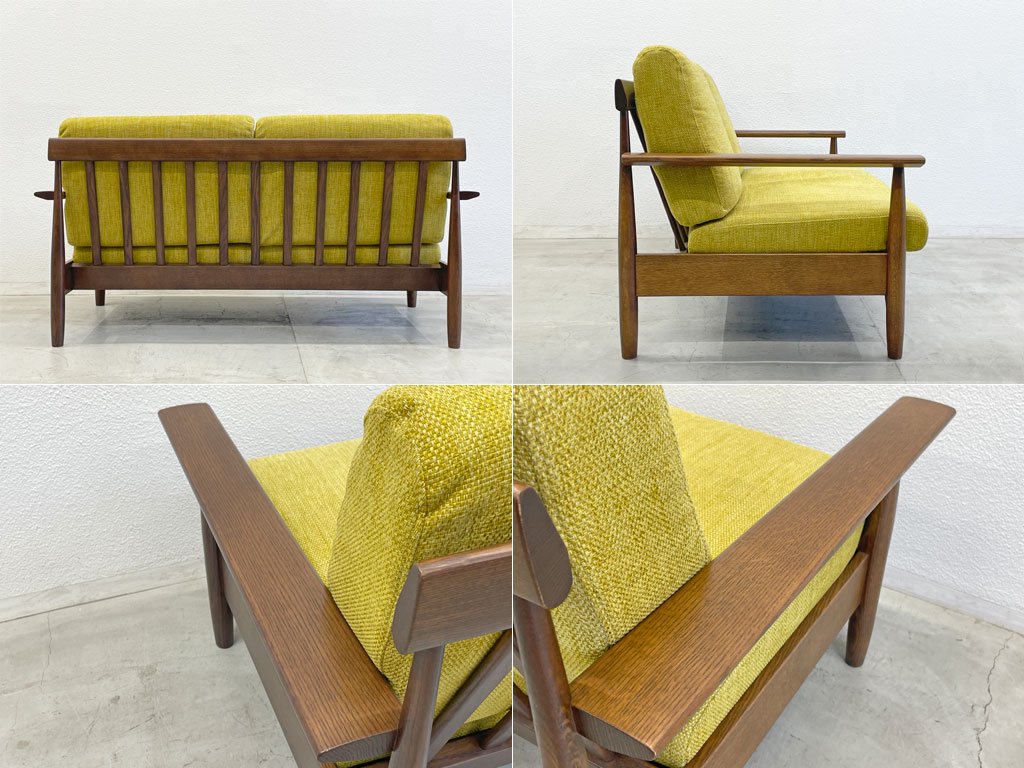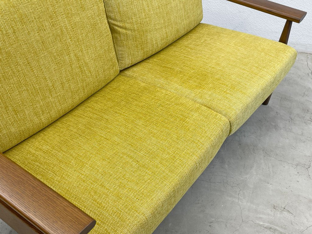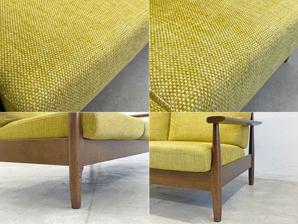 IDC大塚家具で販売されていた柏木工の製造のシガーロ 2シーターソファ。柏木工の高い木工技術による北欧家具を意識したデザインがとても素敵なソファとなります。木目をくっきりと見えるブラウン染色塗装とビビットなライムグリーンのようなファブリックが印象的なソファ。