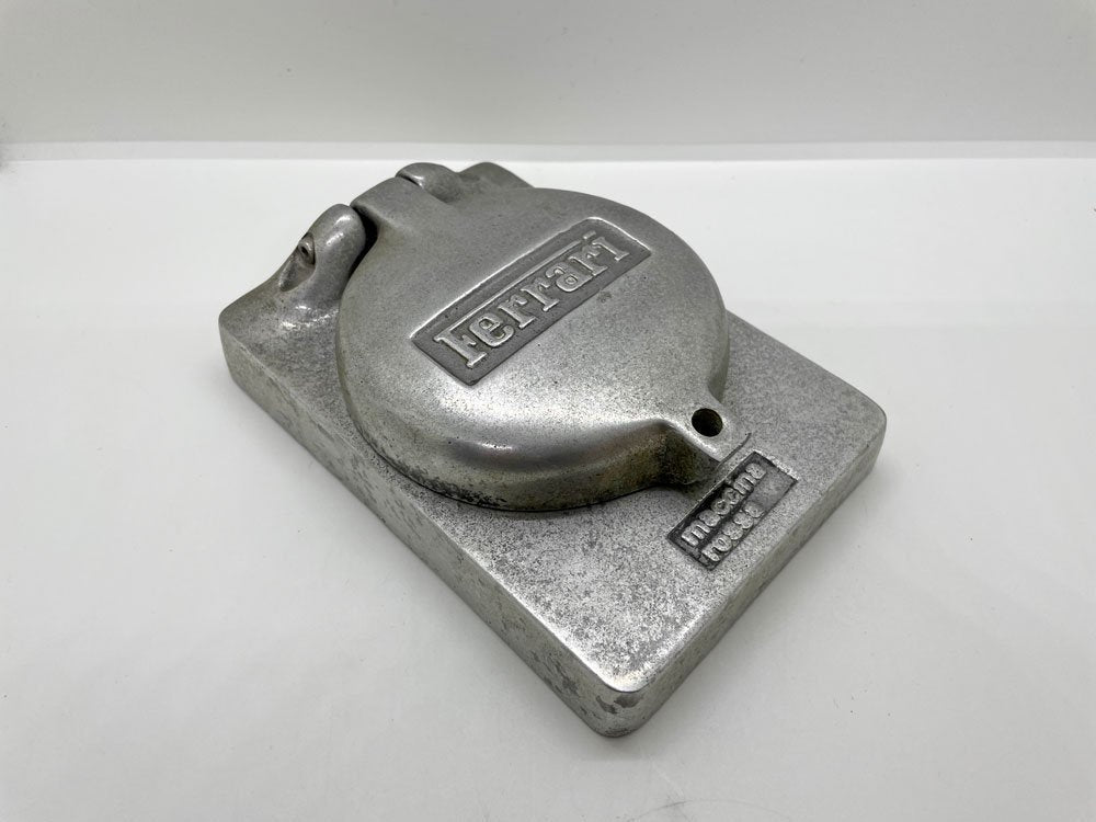 こちらは、ヴィンテージフェラーリのフェールキャップ(給油口)をモチーフにした灰皿。アルミダイキャスト製で重さ約1kgとずっしりとした重量感が感じられます。
