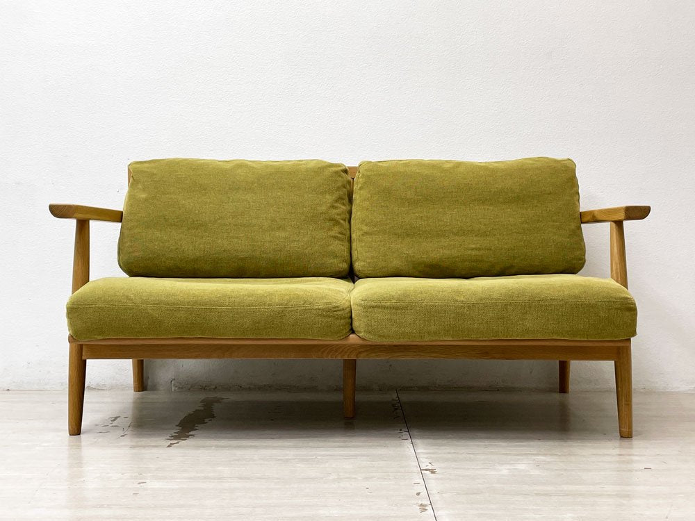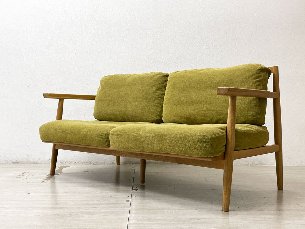 こちらは既に販売が終了されている同社のアームソファになります。温かみあるナチュラル色のオーク材フレームを使用した北欧テイストの2人掛けソファ。爽やかなライトグリーンのファブリックが、明るく落ち着いたリビング空間を演出してくれます。ファブリックはカバーリング仕様になりますので、定期的なクリーニングにより衛生的にも安心してお使い頂けます。