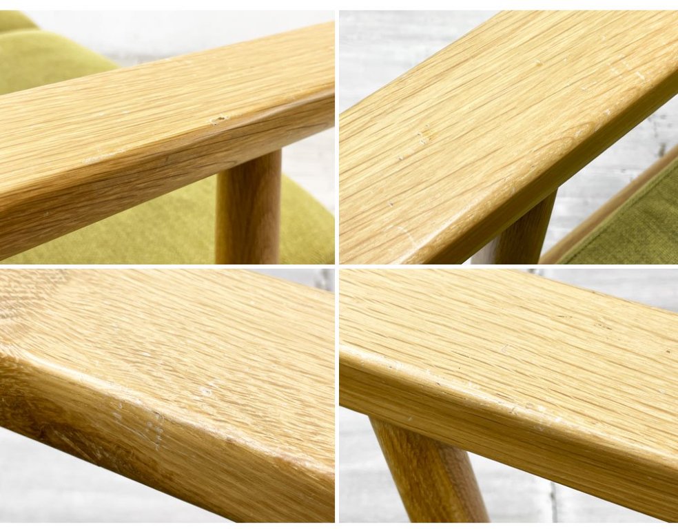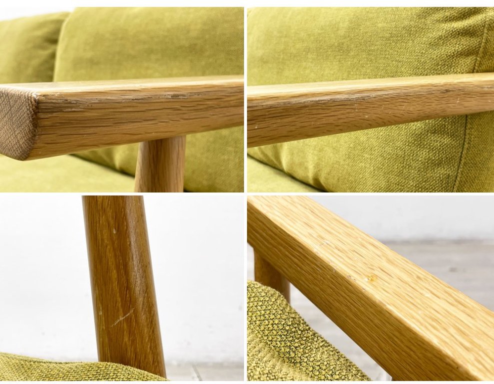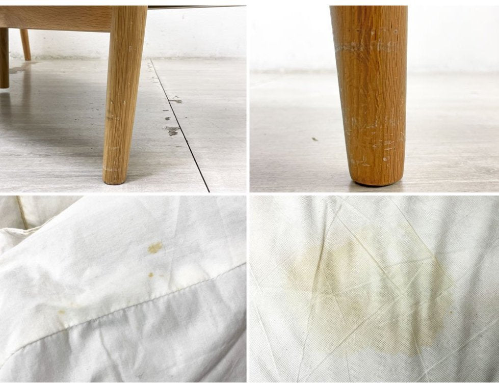 使用に伴う擦れ傷の他、アームや背もたれを中心に打痕や塗装表面の剥がれ等が見受けられますものの大きく風合いを損なうものではございません。ほかクッションにはヌードの薄っすらとした染み、型崩れの他ややヘタリが感じられます。ご使用に問題となるダメージはございませんが、コンディションを鑑みお求めやすいお値段での販売となります。予めご承知の上ご検討下さいますようお願い申し上げます。