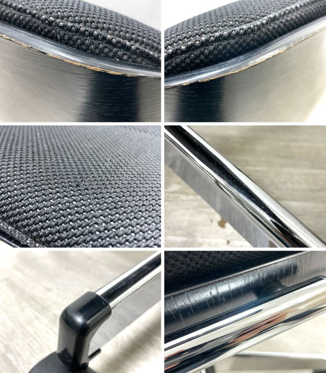 背もたれプライウッドの上部に軽微な擦れとそれに伴うペイントロスが見受けられます。また、ファブリックには微細な糸連れ、脚部ベース部分には細かな線傷が多数見受けられますが、著しく美観を損ねるようなダメージは無く座面のヘタリ等も感じられません。今後も十分実用可能なお品物となっております。
