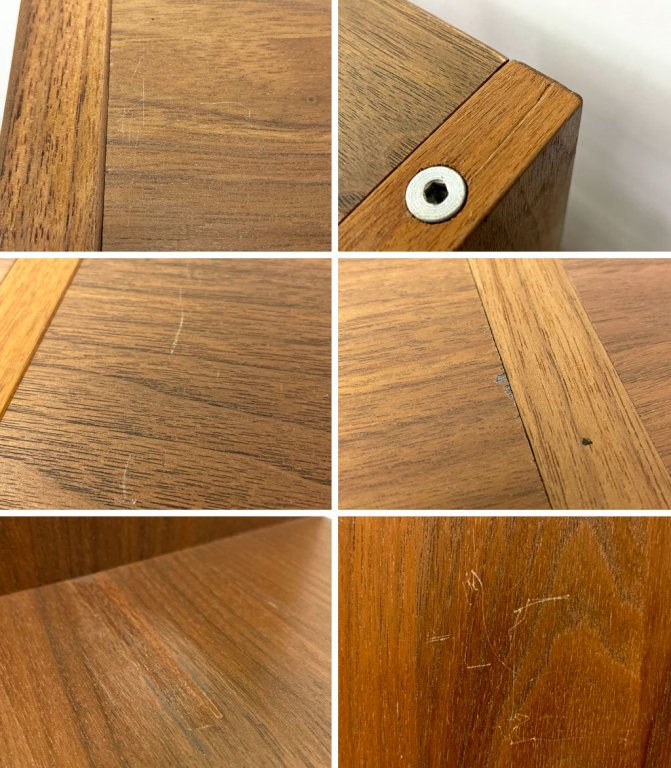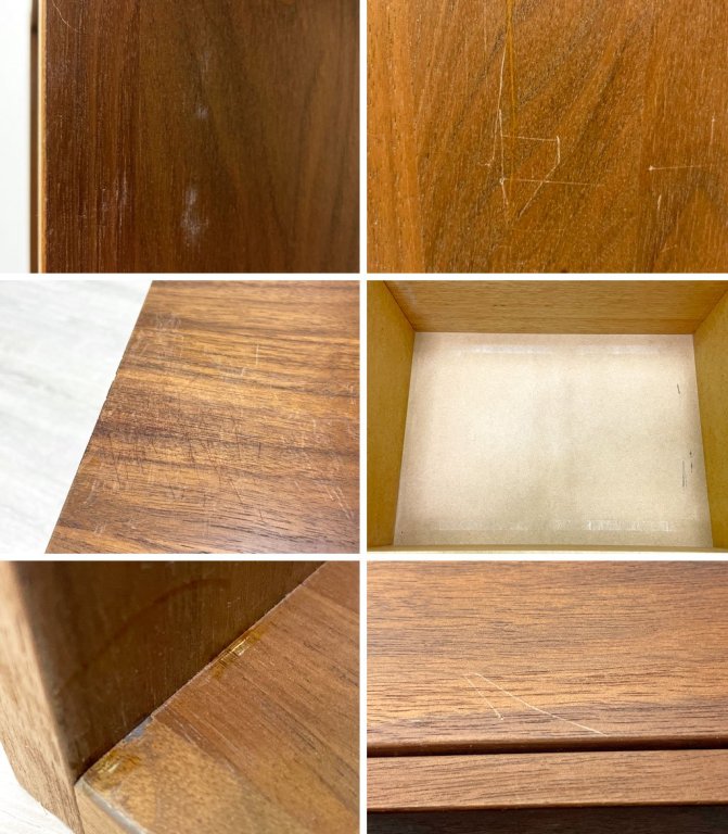 使用に伴う擦れや傷、打痕やペイントロスが散見されますが、ダメージの大きい部分にはタッチアップにて補修しております。また、抽斗内部に取り切れない汚れが見受けられます。ガタツキ等、使用に問題となる様な大きなダメージは無く、これからも安心してご使用頂けるコンディションを保っております。