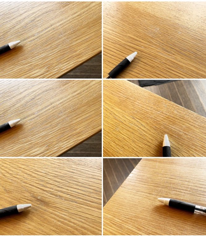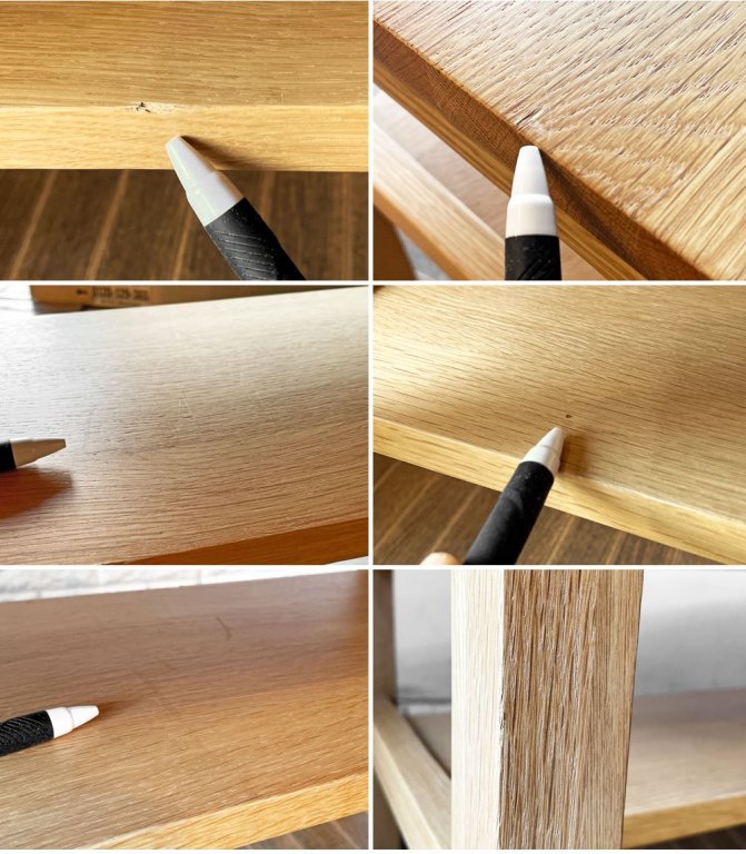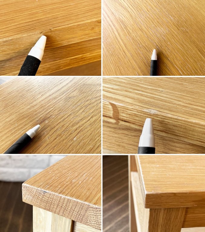 使用に伴い、天板には細かな傷や擦れ、線傷、縁の打痕などやや使用感がございます。その他の箇所にも、線傷や打痕などが見受けられますが、使用上問題となる大きなダメージはございません。これからもまだまだ実用いただけるコンディションを保っております。
