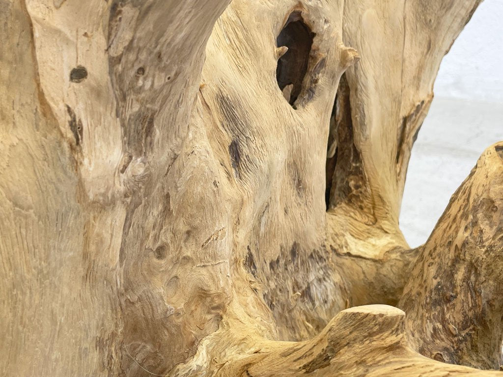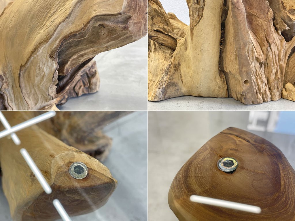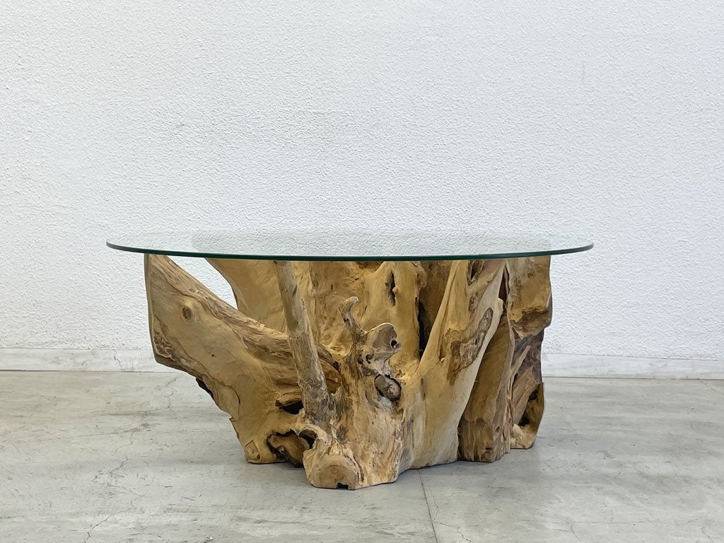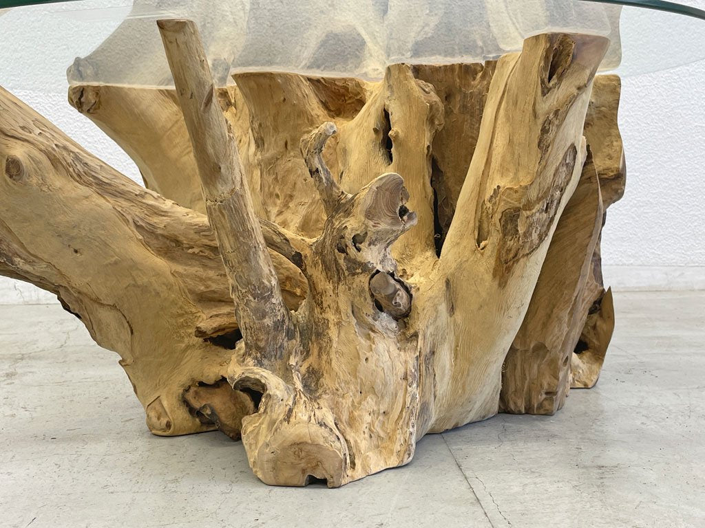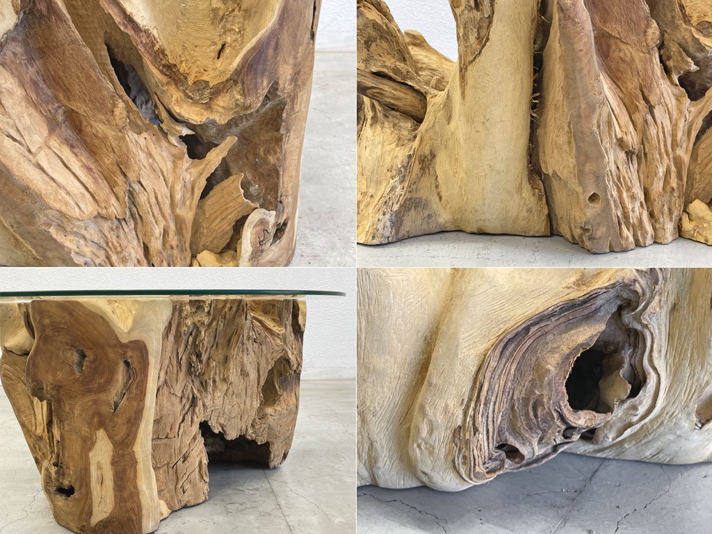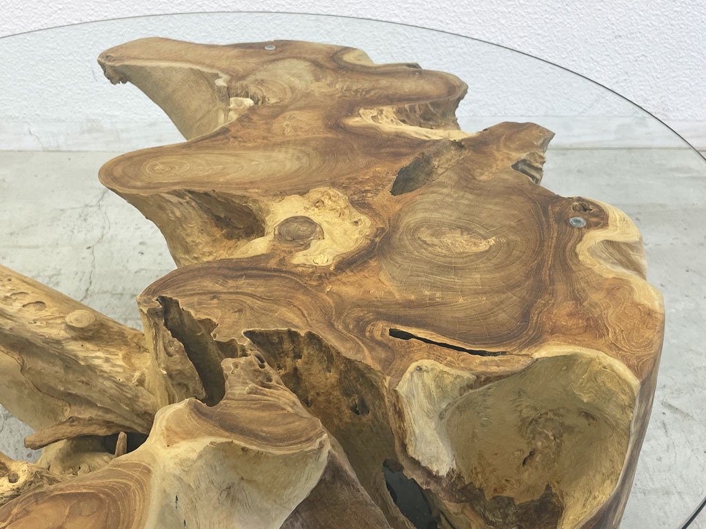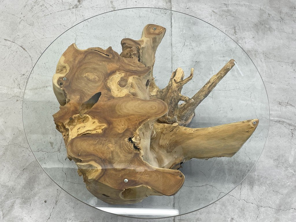 オブジェやアートのような自然体なチークウッドの切り株がそのまま台座になったテーブルデザイン。