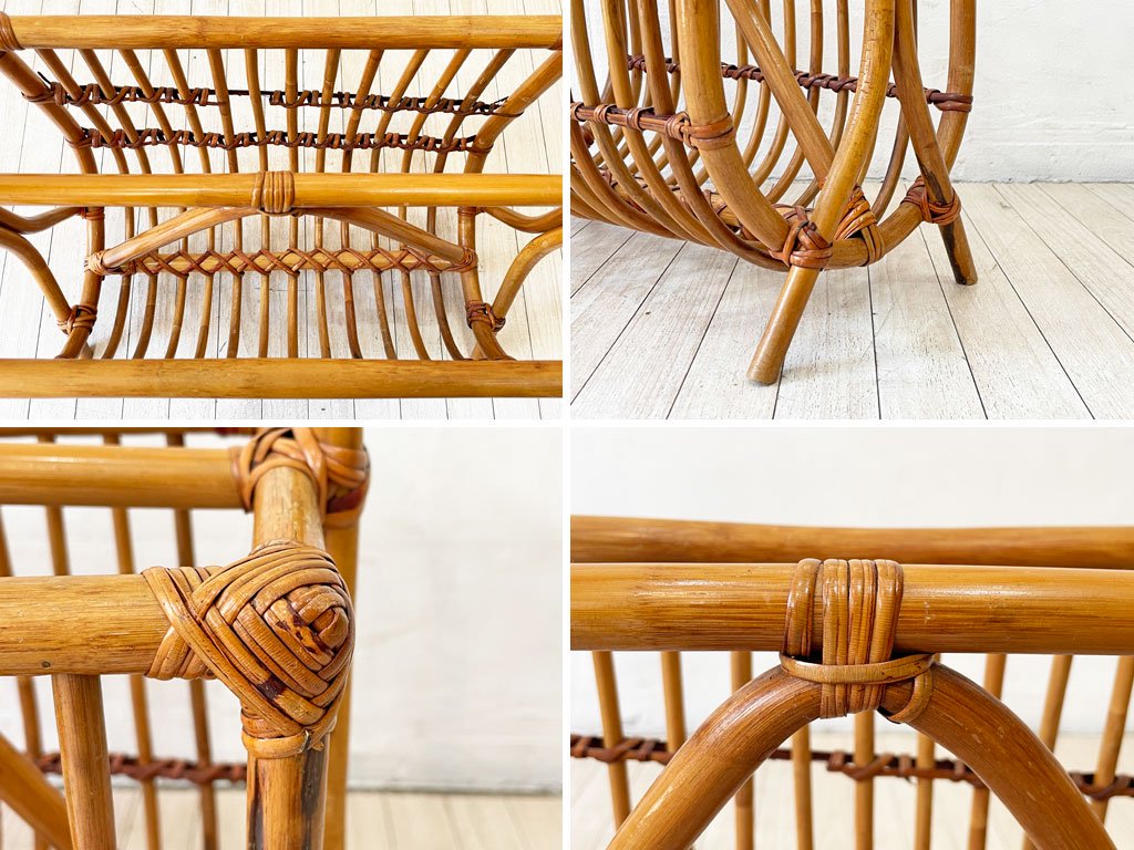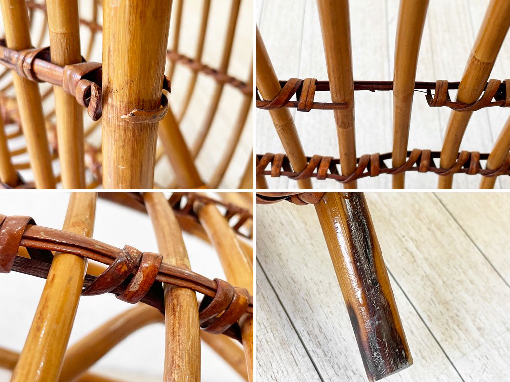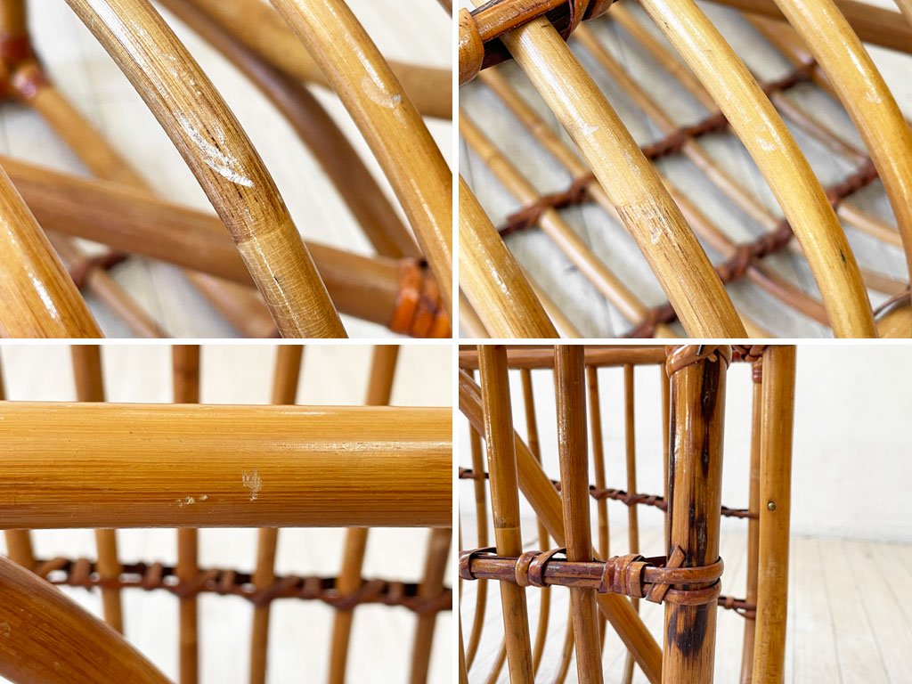 使用に伴う傷や擦れ、表面の剥がれ、落としきれないシミ汚れが全体にございます。また自然素材のラタンを使用しているため、経年による部分的なちぎれやフレームの歪みが見られますが、現状強度に問題ごはざいません。ビンテージなりの使用感は見られますが、これからも実用いただけるコンディションを保っております。