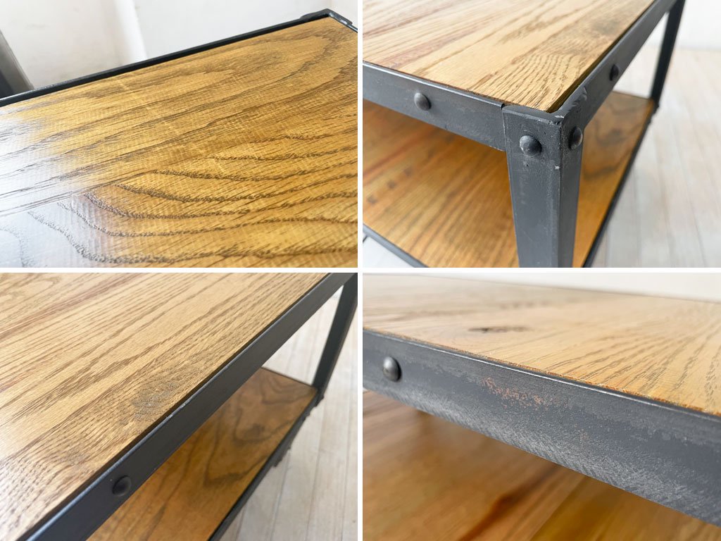 オーク材のはっきりとした杢目とアイアンの渋い色味が魅せる無骨な表情はインダストリアルテイストのお部屋によく合います。