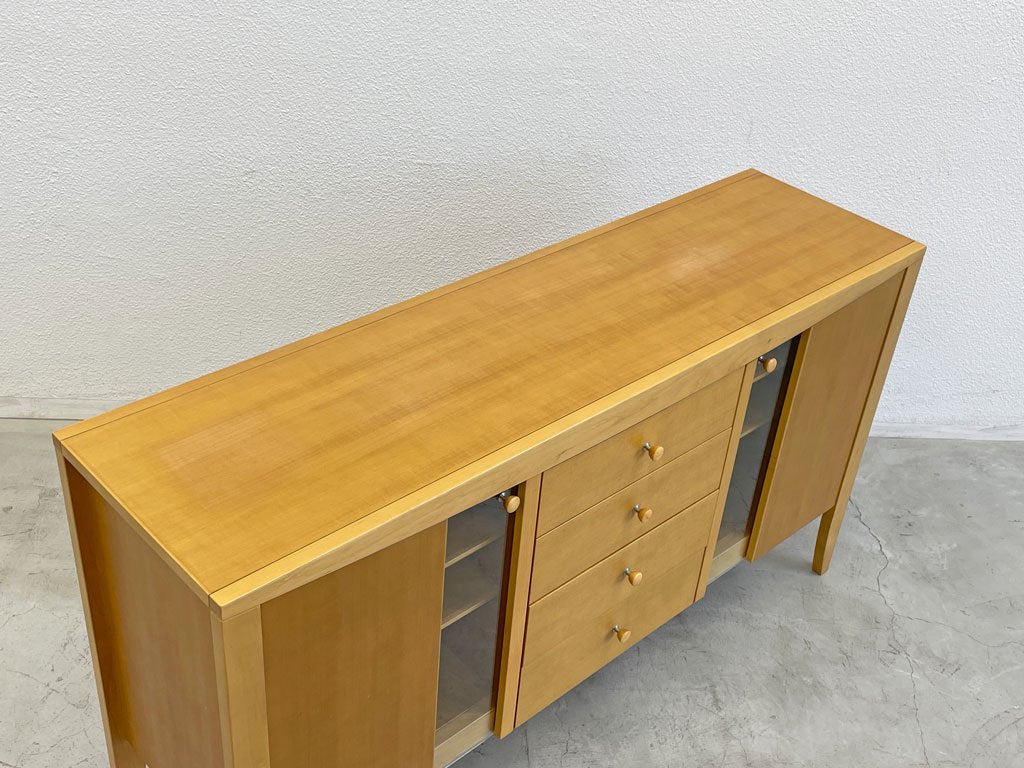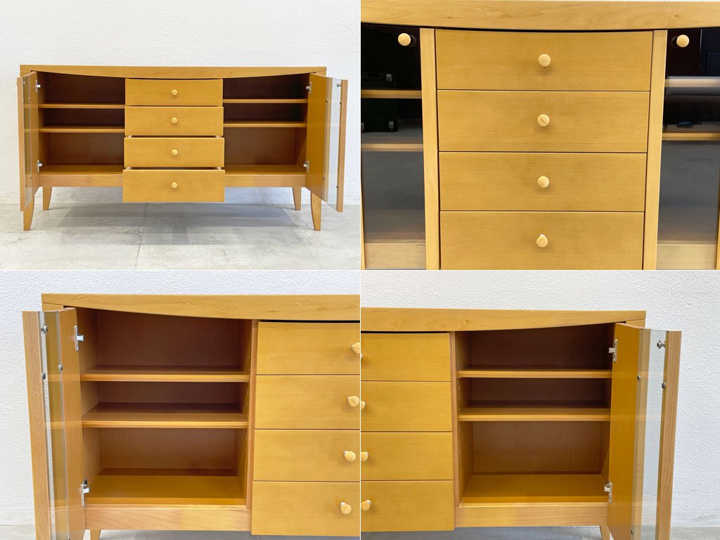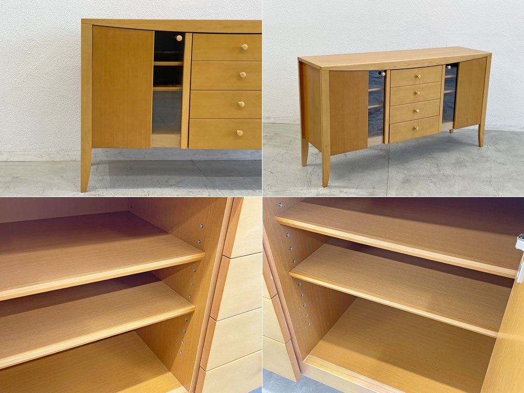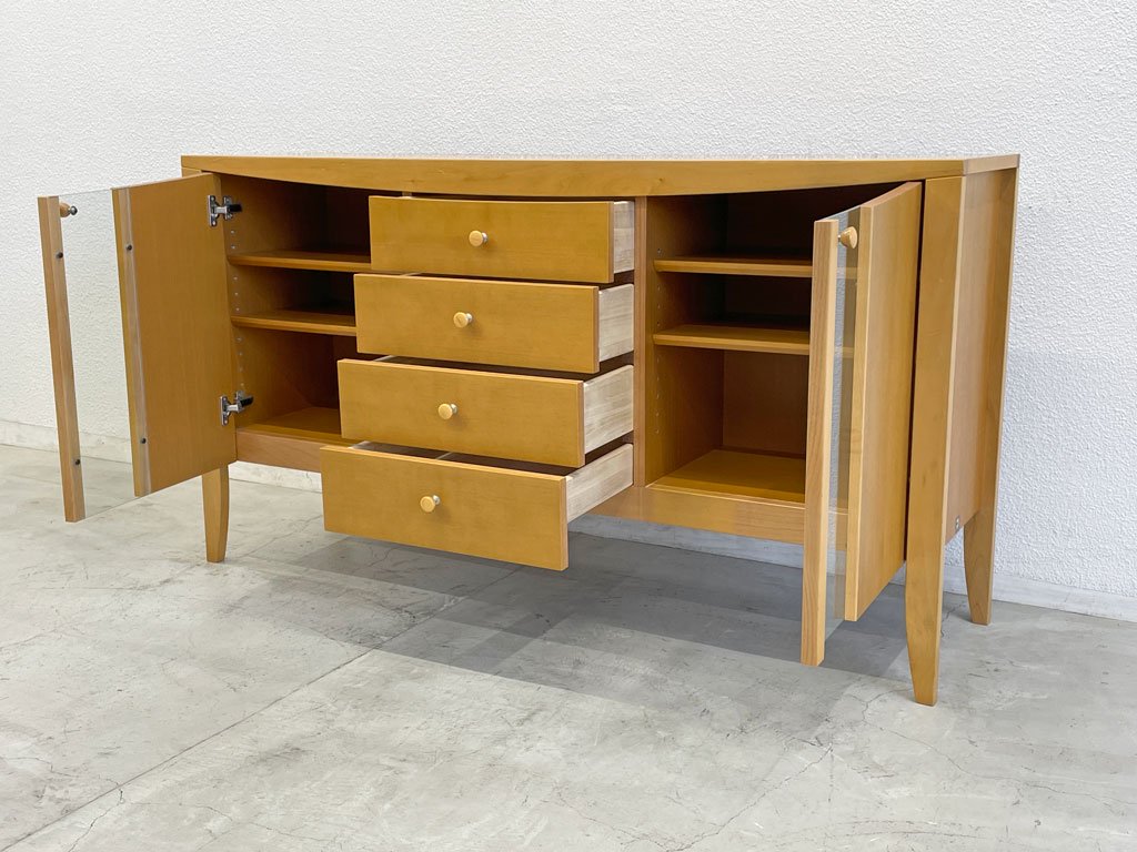 中央には4つのドロワーと両サイドには2つのキャビネットが備わり、使い勝手と収納面のバランスの良いサイドボード。