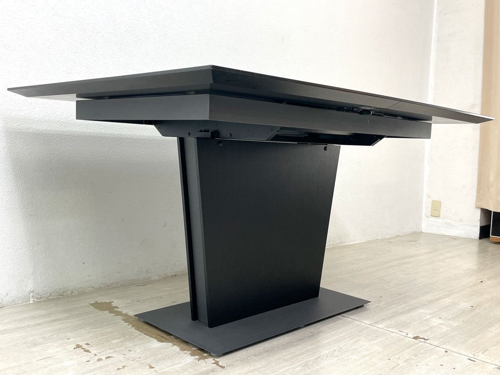 異素材をミックスし、素材の表情の違いを引き立てたアーバンモダンデザイン。使用人数に応じて天板のサイズを変更出来る伸長式テーブルとなり、メイン天板を左右に開く事で、天板下に格納された追加天板を引き出す事が出来、食卓や会議用テーブルとして広々ご使用頂く事が可能です。
