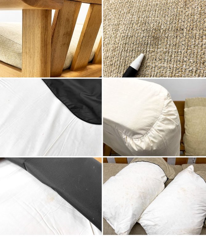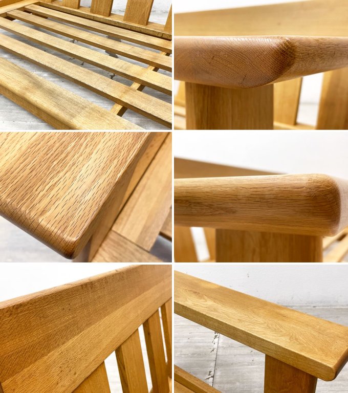 使用に伴う擦れ傷の他、細かな打痕やうっすらとしたヤケ、フレームにはクッションとの接触面に黒ずみ、全体的に木材由来の油分による細かな染みが散見されますものの、いずれも風合いを損なうものではございません。ほかアームクッションのヌードには経年による染みが見られますが、目立ったヘタリは無く、贅沢な無垢材フレームにふさわしいくつろぎの座り心地を引き続きお楽しみ頂ける、USED品として概ね良好なコンディションを保っております。