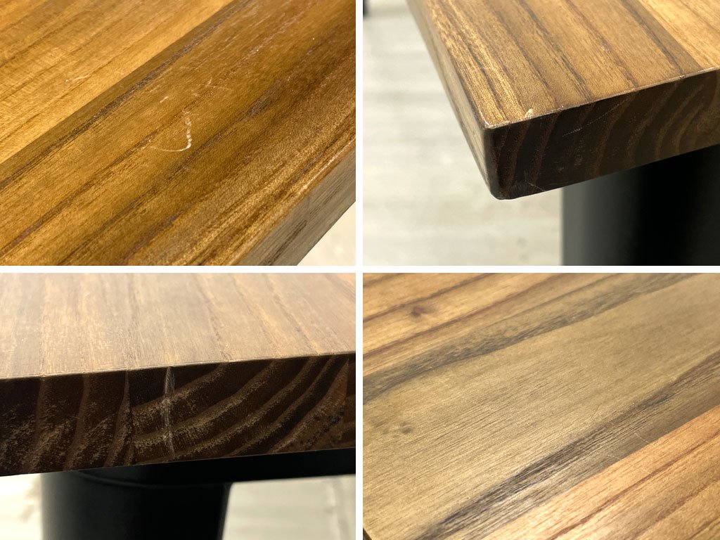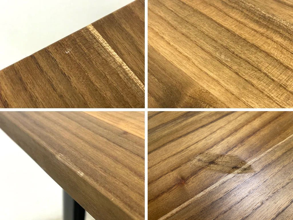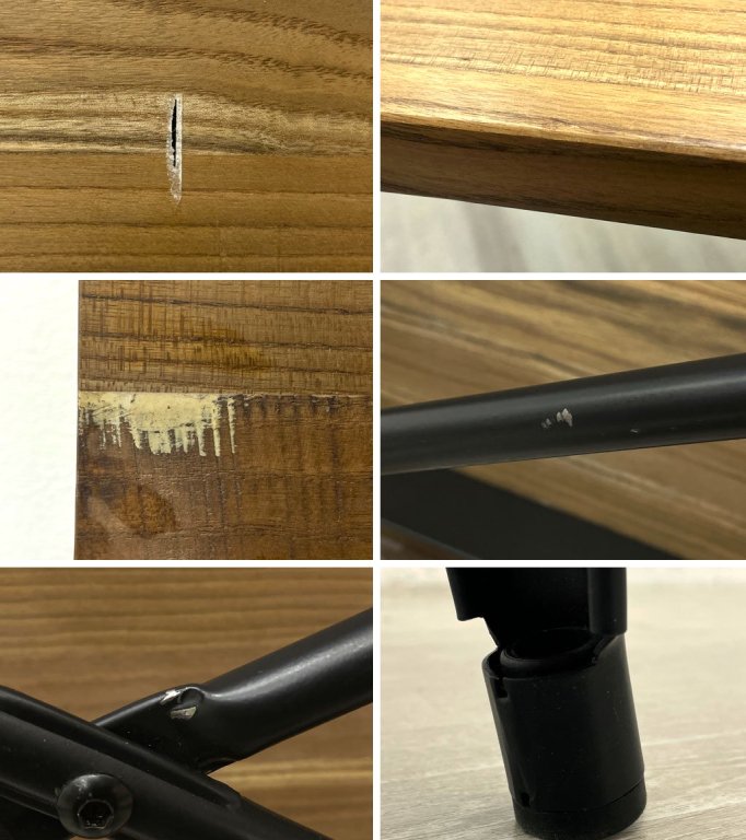 天板に一箇所焼焦げを削り取った事による幅5cm程の凹凸、その他、擦れ傷、軽微な打痕が数箇所ございます。また、フレームには擦れによる僅かな剥がれが見受けられますが、グラつき等目立つような大きなダメージは無く、これからも安心してご使用頂けるコンディションを保っております。