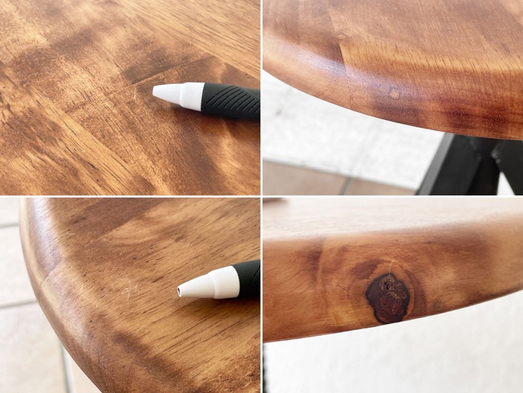 使用に伴い座面に小傷と僅かな染み、無垢材特有の軽微なクラック、脚に僅かな汚れはございますが、いずれも美観を損ねるものではございません。ガタツキや割れ等使用上問題となるダメージも無く、良好なコンディションを保っております。