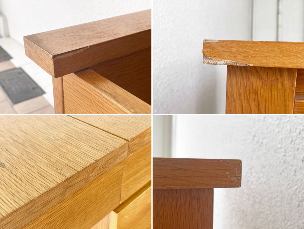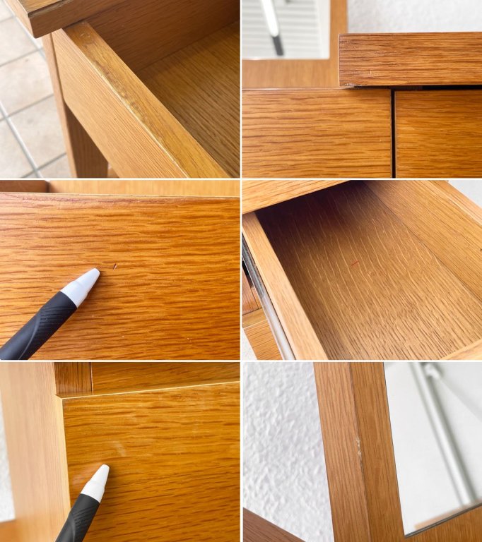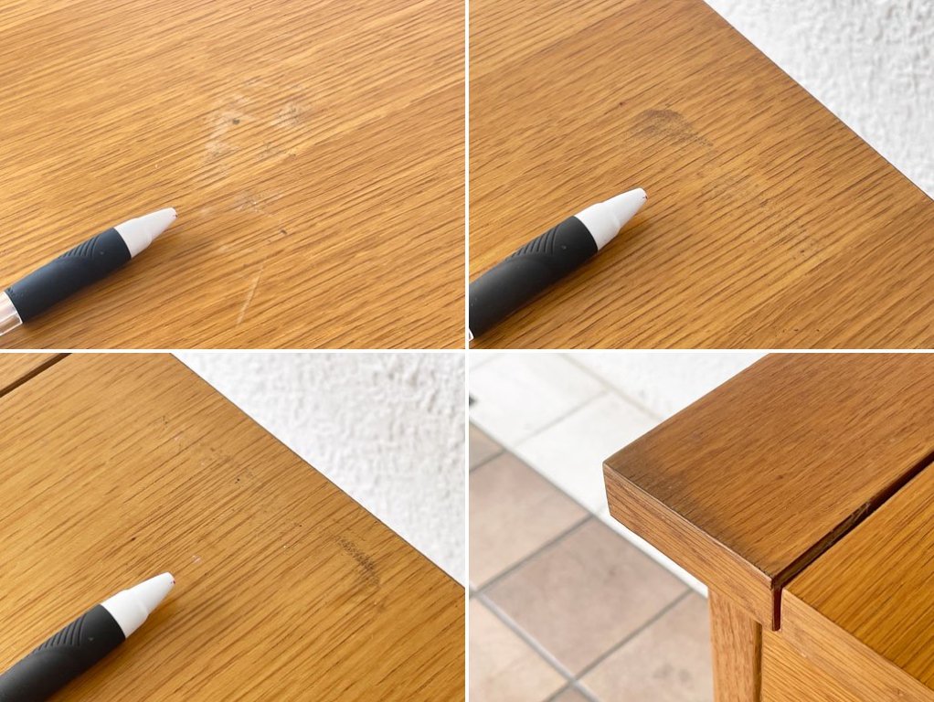 使用に伴い天板や収納スペース角に突板の剥がれ、天板表面には擦れ、色褪せ、取りきれない汚れや突板の僅かな凹凸、その他各所に着色汚れや打痕等が見られ、全体的にやや使用感がございます。しかしながらガタツキや割れ等使用上問題となるダメージは無く、これからも安心してご使用頂けるコンディションです。