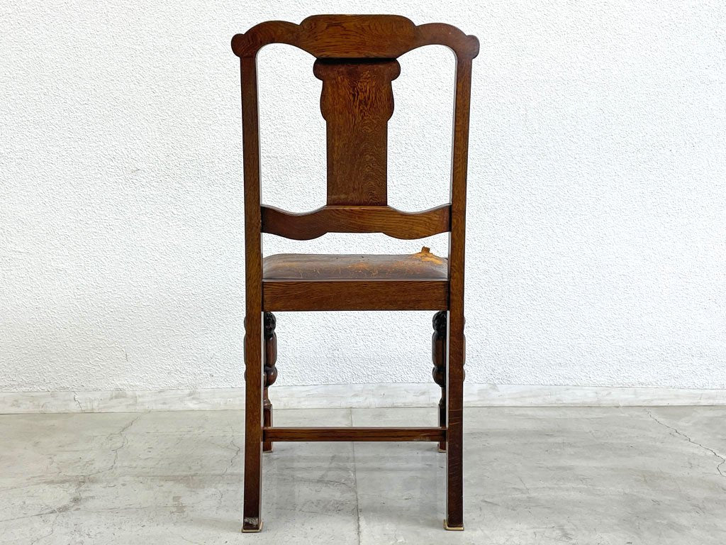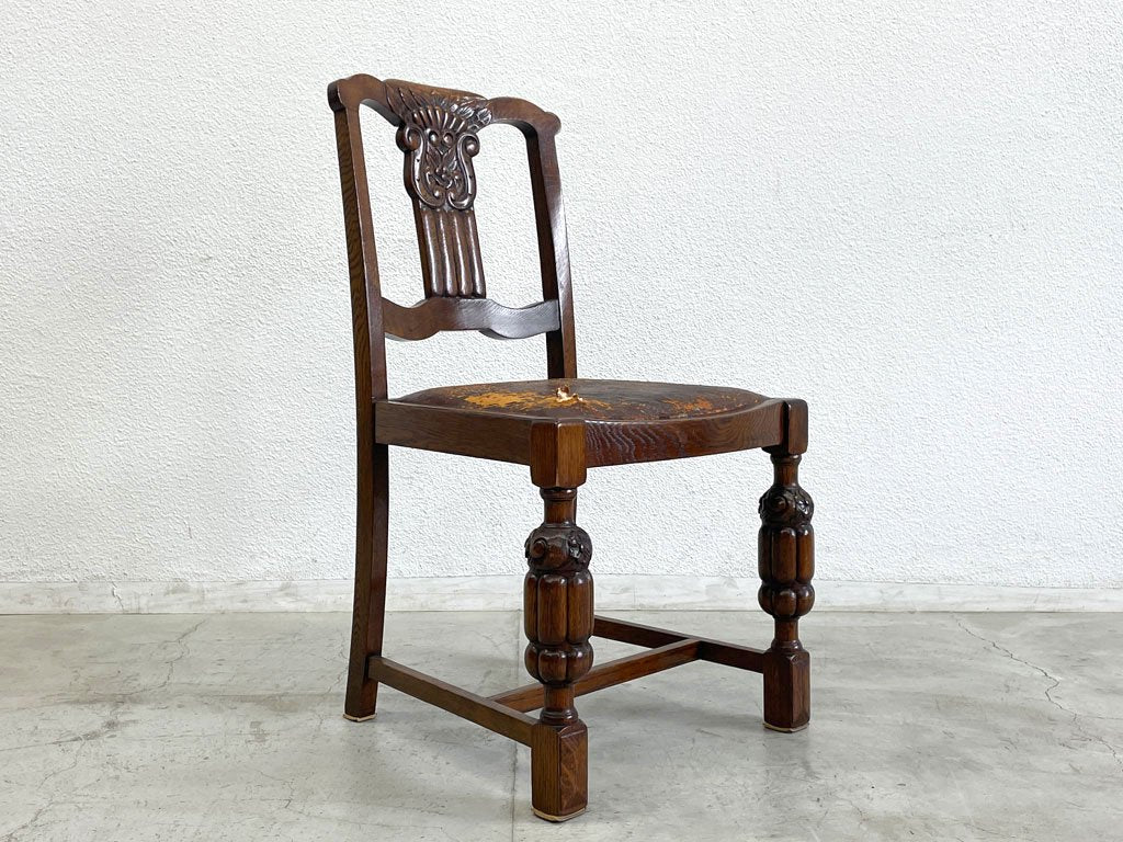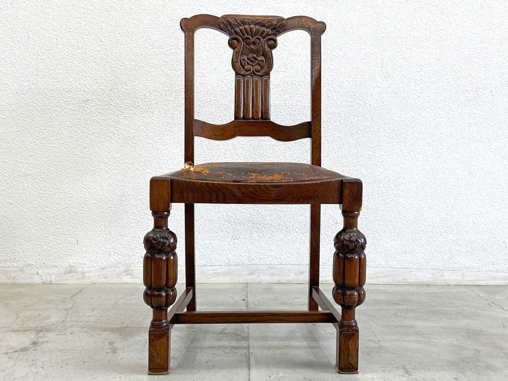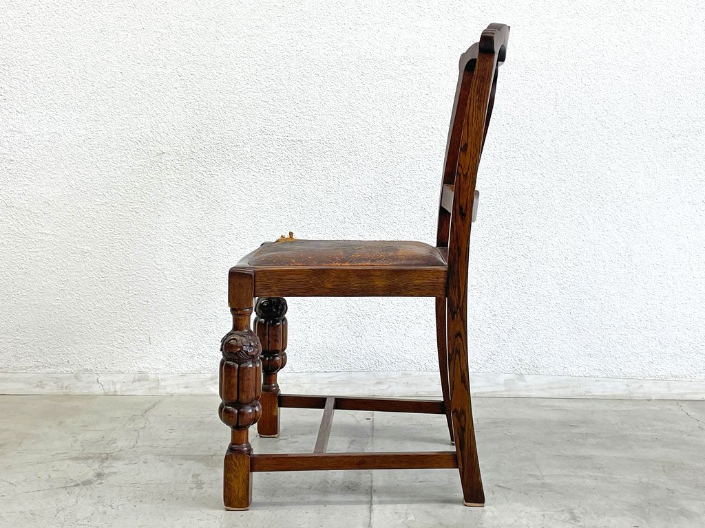 UKビンテージ Vintage ダイニングチェア オーク材 レザーシート バルボスレッグ 彫刻装飾 英国アンティーク B