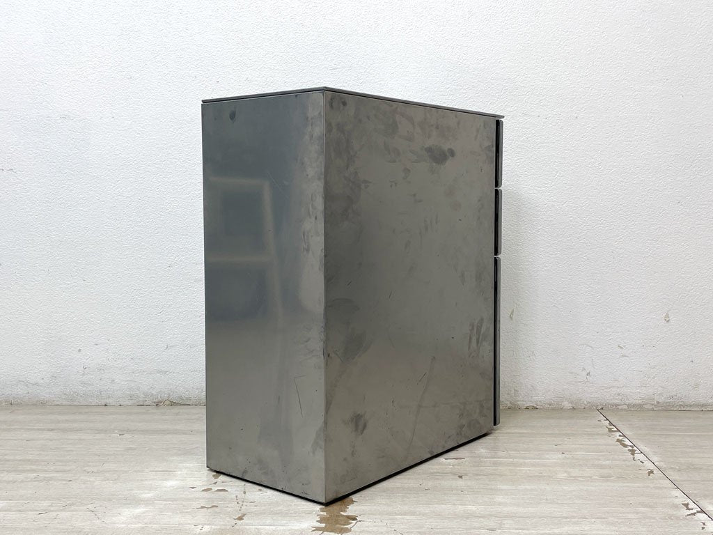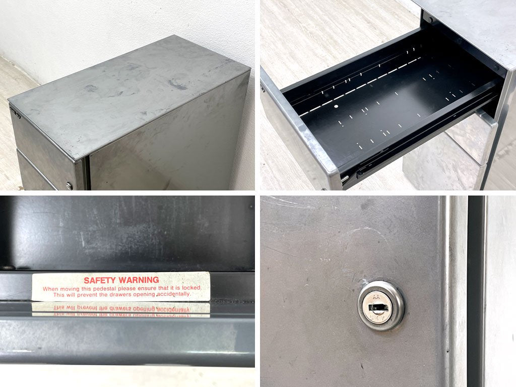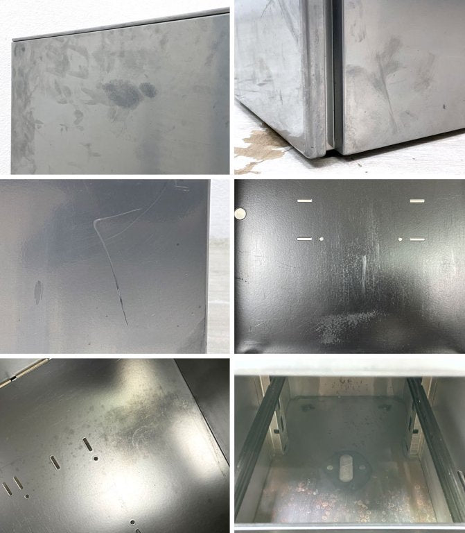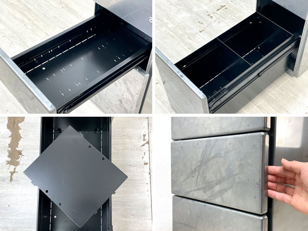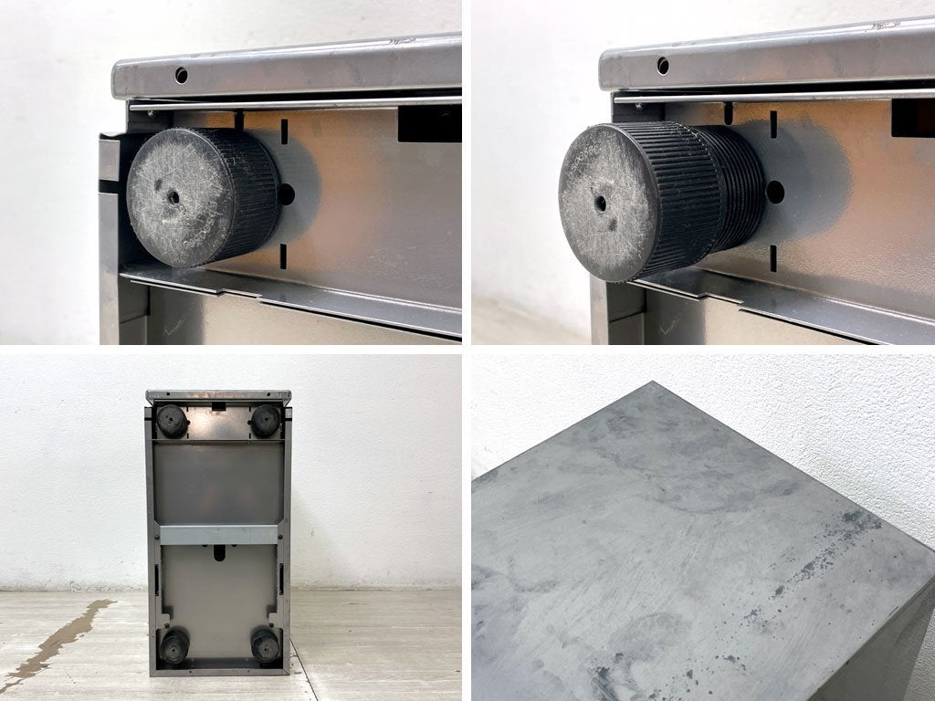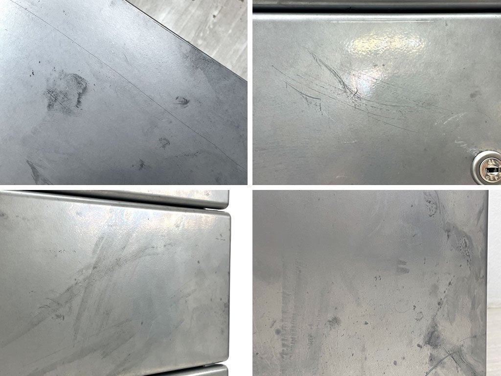 経年・使用に伴い全体的に金属特有のくすみや染みなどが見受けられます。また抽斗内部には細かな擦れや傷がございますが、抽斗の開閉などのご使用に問題となるような不具合はございません。やや使用感はあるものの、今後も十分実用頂けるコンディションを保っております。