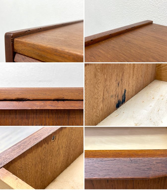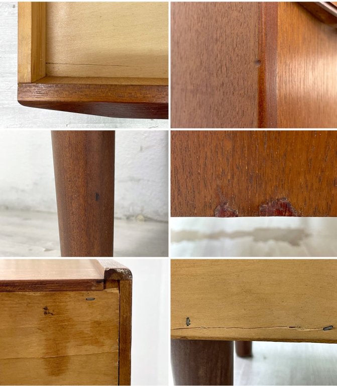 こちらはビンテージのお品物です。使用に伴い天板縁や抽斗縁、脚部などに細かな打痕、抽斗内部に落としきれない染みや汚れなどが見受けられます。また、側面下部に小さな補修痕、背板にひび割れなどがございます。
