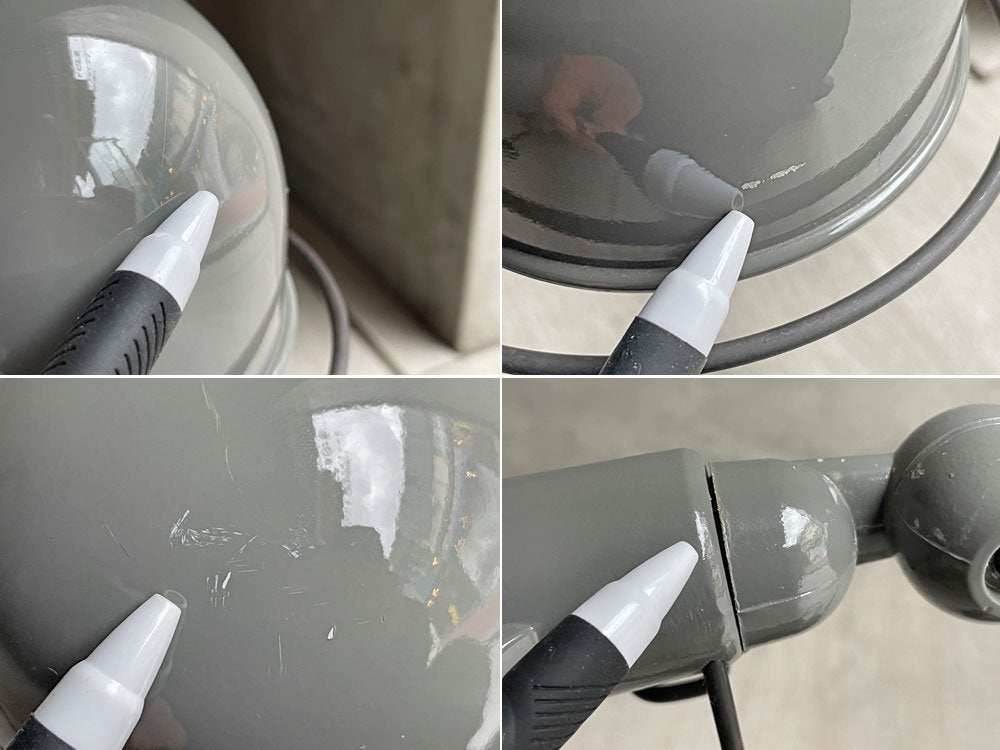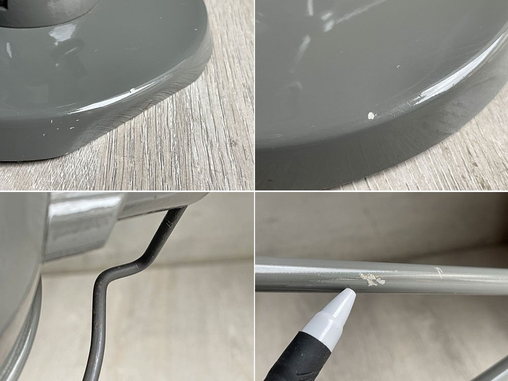 使用に伴い、打痕や擦れ、線傷等が散見され、それらによるペイントロスが見受けられます。シェード部分に僅かな凹み、ベース部分にはやや目立つ凹みがございます。また、シェードとフレームの接合部には隙間が生じており、ジェルデのブランドシールは剥がれております。その他ご使用頂く上で支障を来す様な大きなダメージは無く、点灯作業も問題無く行えており、これからも実用頂けるコンディションを保っております。