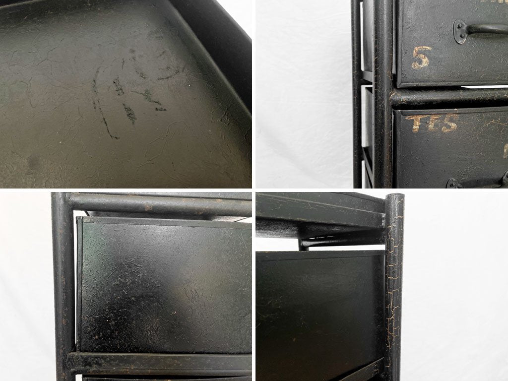 こちらは、ビンテージ加工が施されたお品物となします。塗装の剥げや割れ、錆やくすみ等は製造上の仕様となります。また、使用に伴い、擦れ傷、打痕やドロワー内のテープ痕などはございますが、雰囲気を損なうダメージではございません。その他、ご使用に問題となる大きなダメージも無く、USED品として概ね良好なコンディションを保っております。