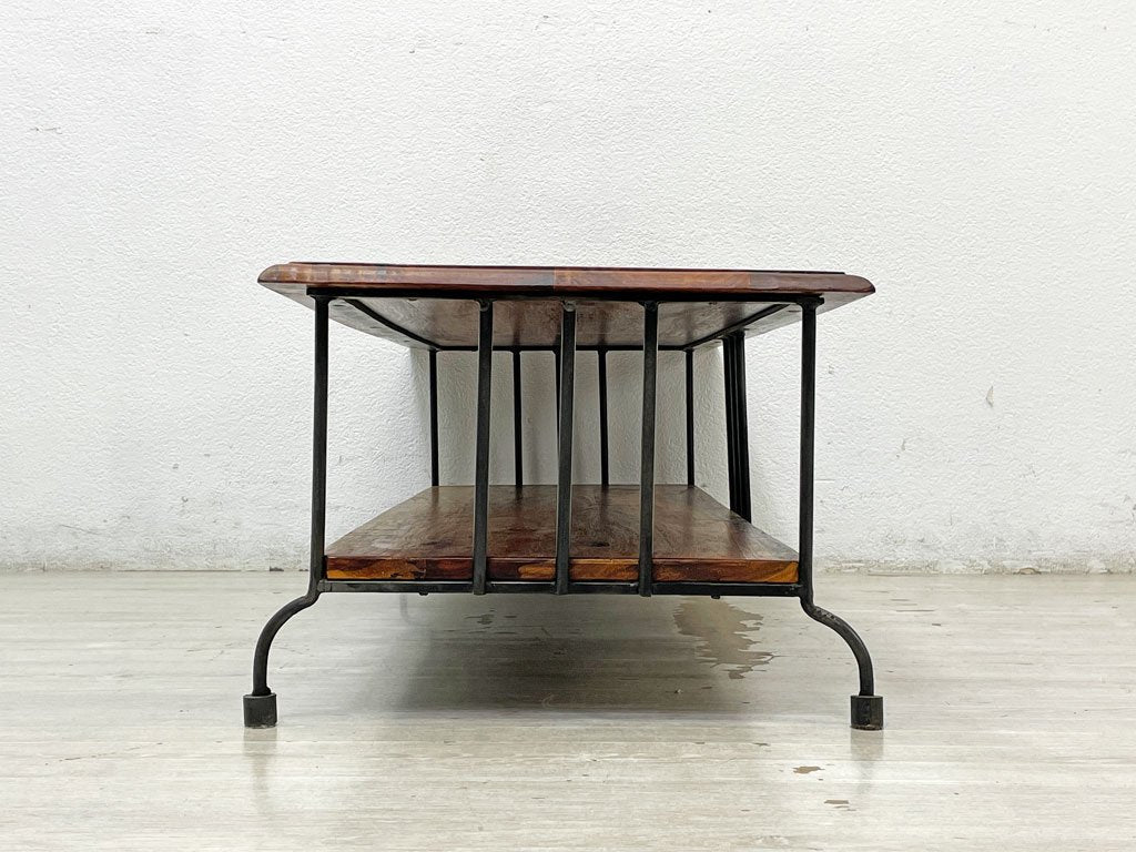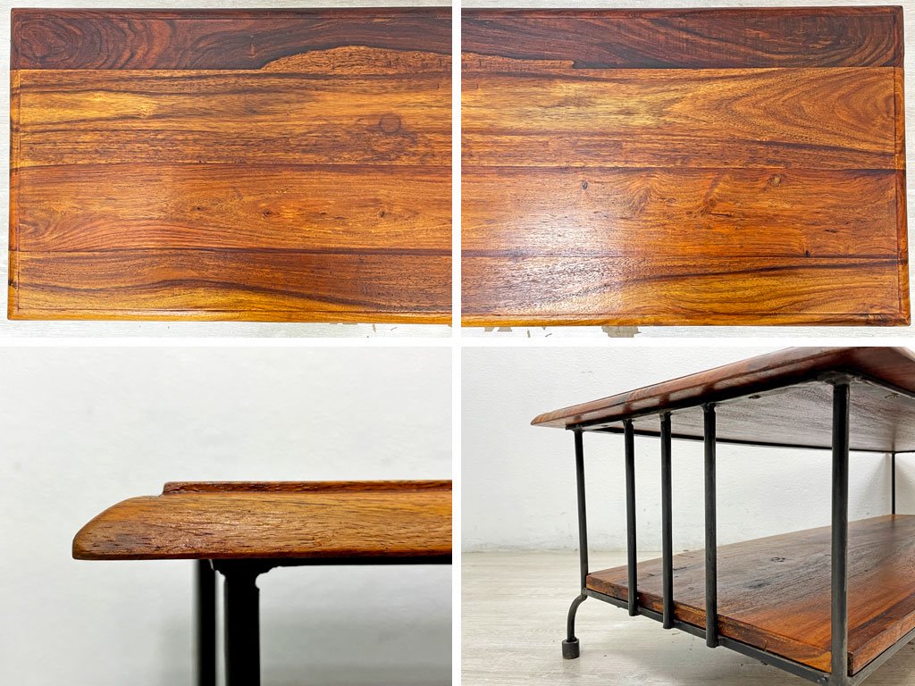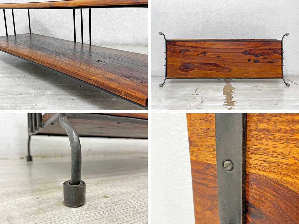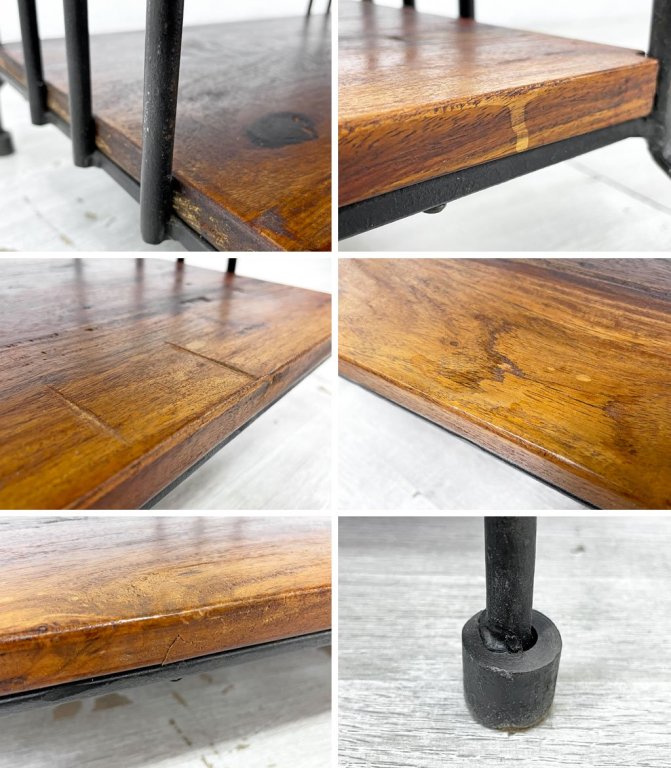 天板には使用に伴う擦れや線傷、打痕、ペイント痕、輪染み、落としきれない汚れ、色ムラ、無垢特有の若干の反り等が見られ、脚部にはアイアン特有の錆びやくすみなどが見受けられます。