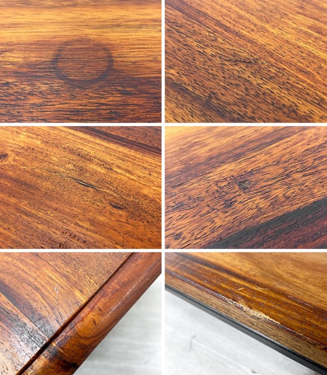 また、木部には木材の節や表面のザラつき、表面の僅かなヒビが見られますが、天然木による自然の風合いとしてお楽しみくださいませ。その他脚部に僅かな歪みが確認できますが、グラつきやガタつき等は見られません。今後とも雰囲気を楽しみつつご使用いただけるコンディションを保っております。