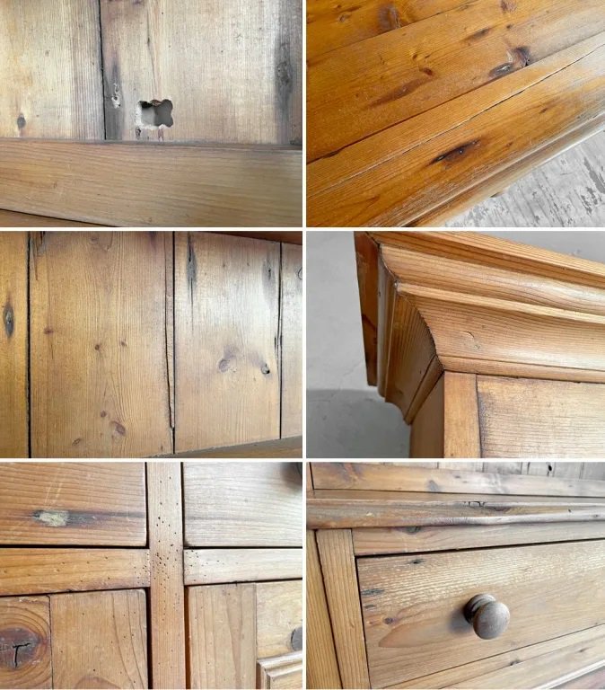 背板に配線を通すための穴が開けられております。全体的に打痕や線傷、擦り傷が散見されるほか、中段の天板や背板の各所に無垢材特有のひび割れがございます。また、背面はささくれがございますので、お取り扱い時は十分にお気を付けください。経年なりの使用感は見られるものの、通常使用においての不具合は無く、これからも実用可能なビンテージ品になります。