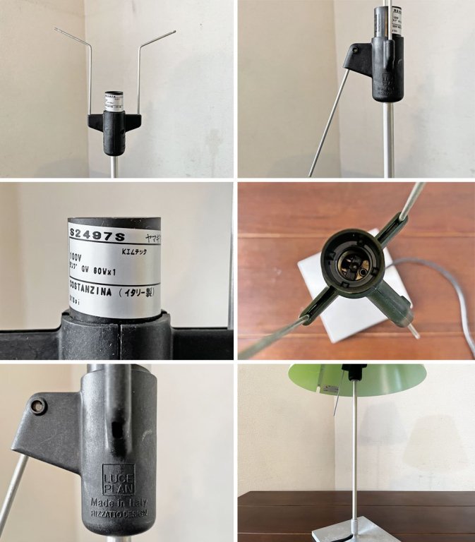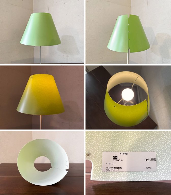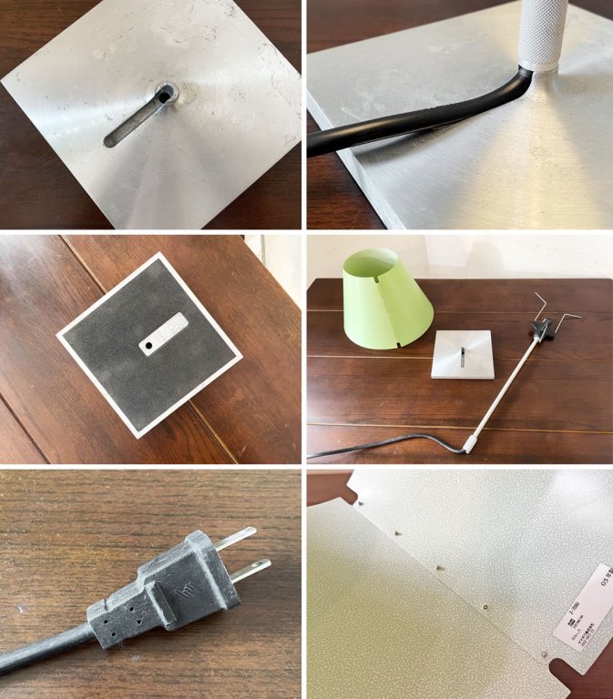 使用に伴い、シェードには割れや亀裂、線傷、黒ずみ汚れ等が見受けられます。また、ソケットや支柱、ベースには擦れや傷、くすみなどが確認できるとともに、コードには取り切れない汚れがございます。もともと分解できる設計上、支柱とベースの接続部分には若干の遊びがあり完全に固定がされませんが、通常使用は問題なく行えます。やや使用感のあるコンディションを加味し、通常よりお求めやすい価格での販売となります。この機会にぜひご検討くださいませ。