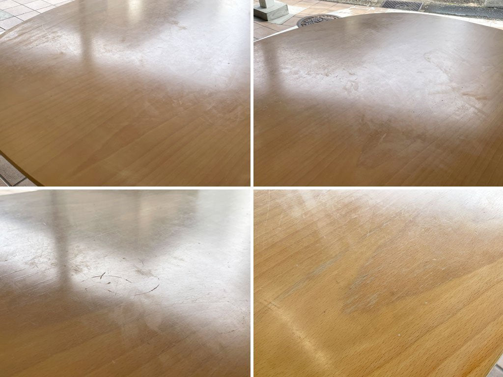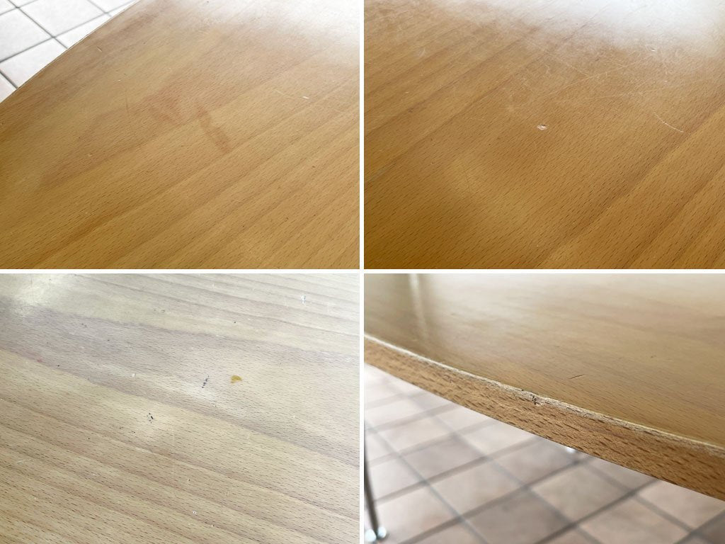 使用に伴い天板には擦れ、ペイントロス、突板の僅かな凹凸の他、うっすらとした輪染み、色むらや細かな着色汚れ等が見られますが、著しく美観を損ねるものではございません。