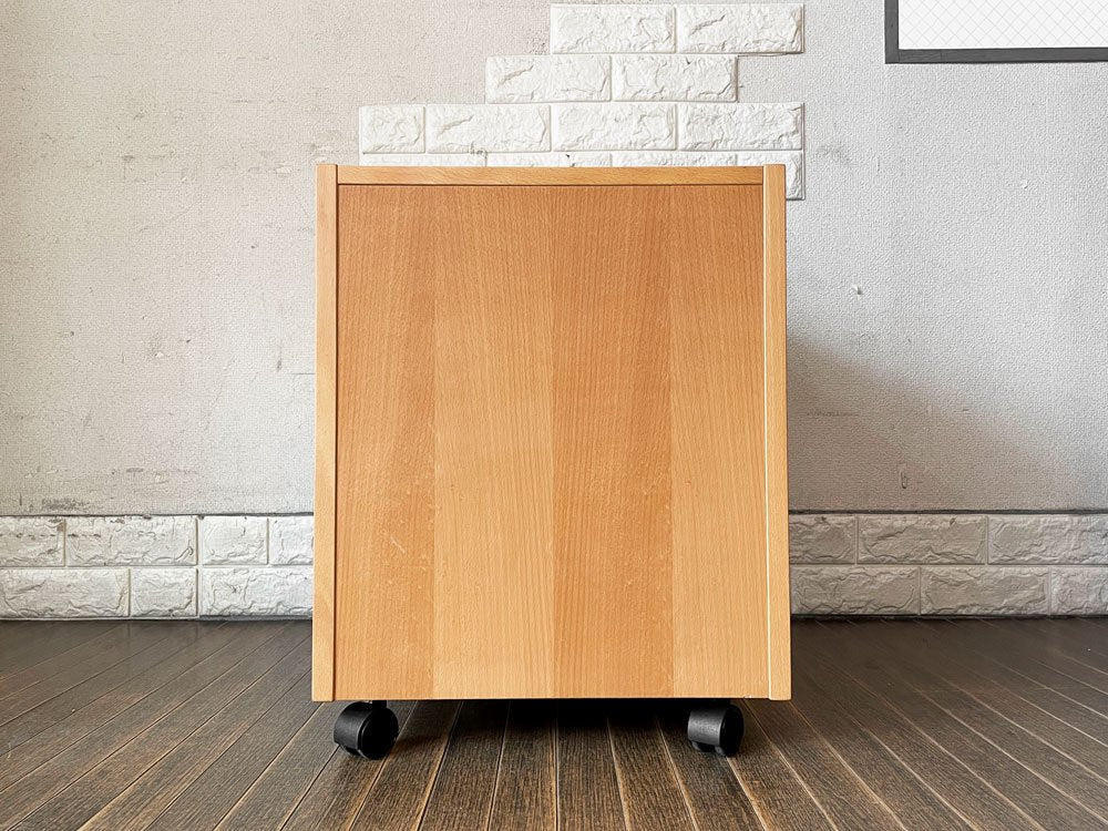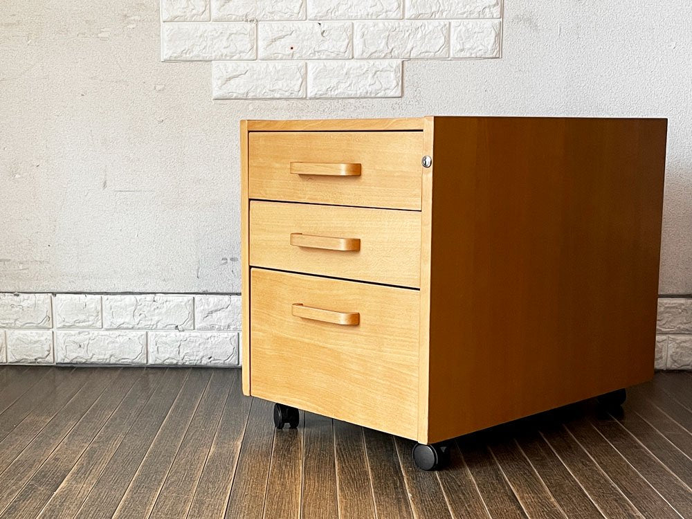 こちらは、ナチュラルなビーチ材の3段デスクキャビネット。装飾のないシンプルなデザインが素材感を際立たせています。