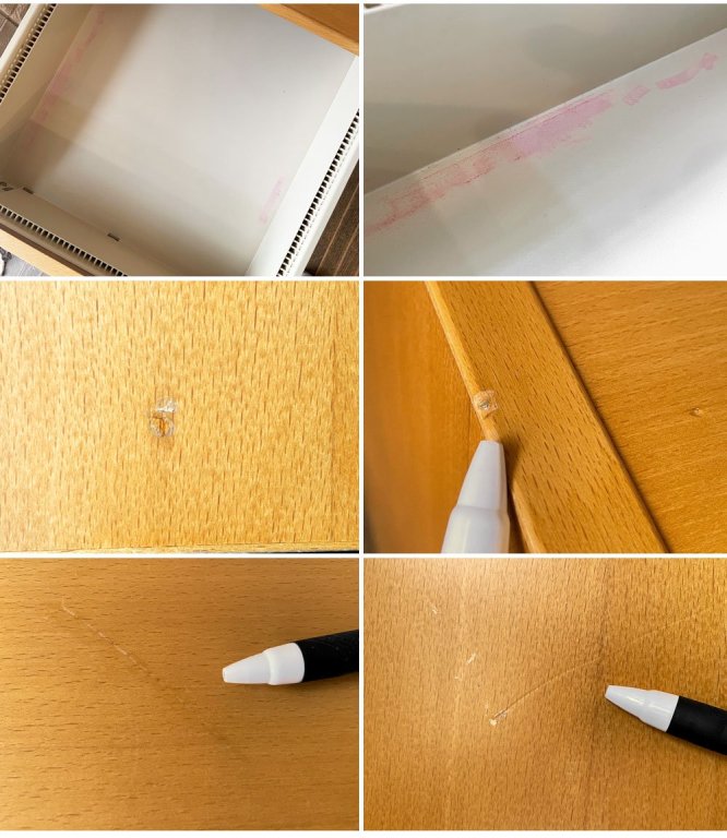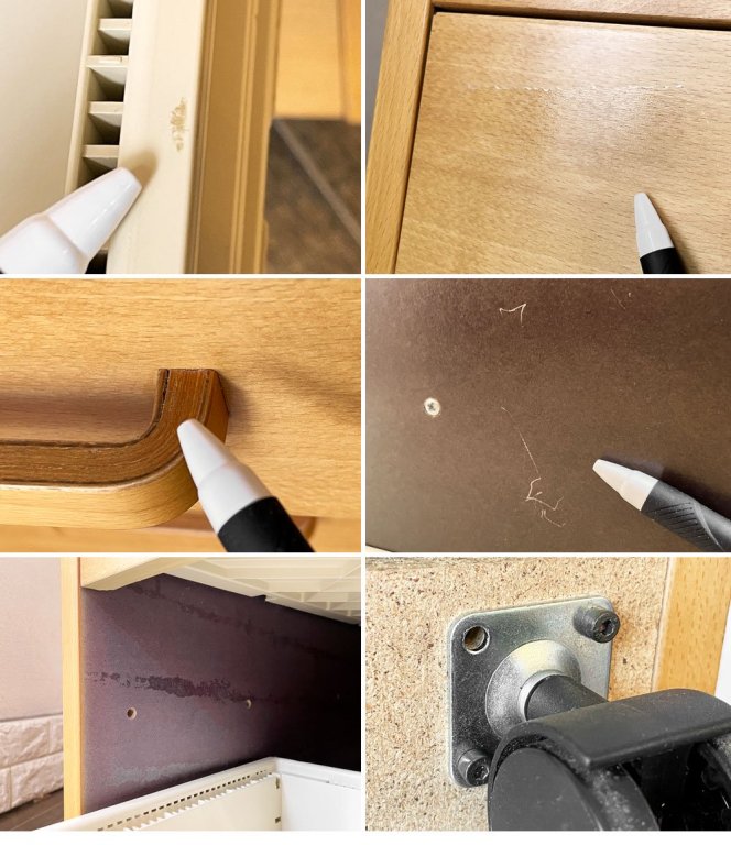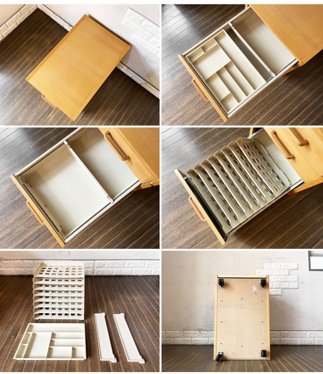 使用に伴い、全体に擦れや傷、打痕、縁の削れ、表面塗装の艶のムラなどが見受けられます。その他、抽斗内部やペントレーの取り切れない汚れ、キャスターの固定用ネジがキャスターひとつにつき1本ずつ、計4箇所欠品しておりますが、ご使用に支障となるダメージはございません。抽斗やキャスターの動作もスムーズで、今後もまだまだ実用頂けるコンディションを保っております。
