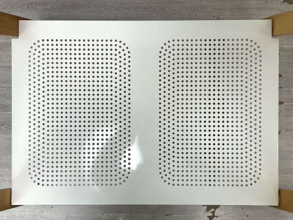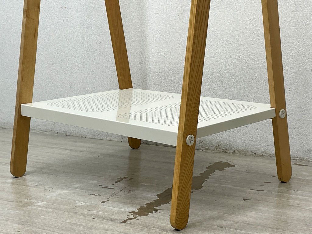 ポール部分のネジ穴は大きく強調され、装飾のようなデザイン。棚板にはパンチング加工が施されておりモダンな印象に仕上がっています。